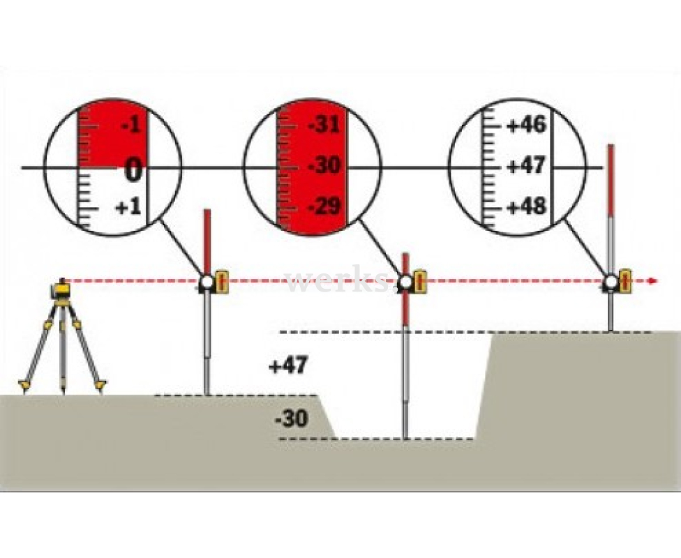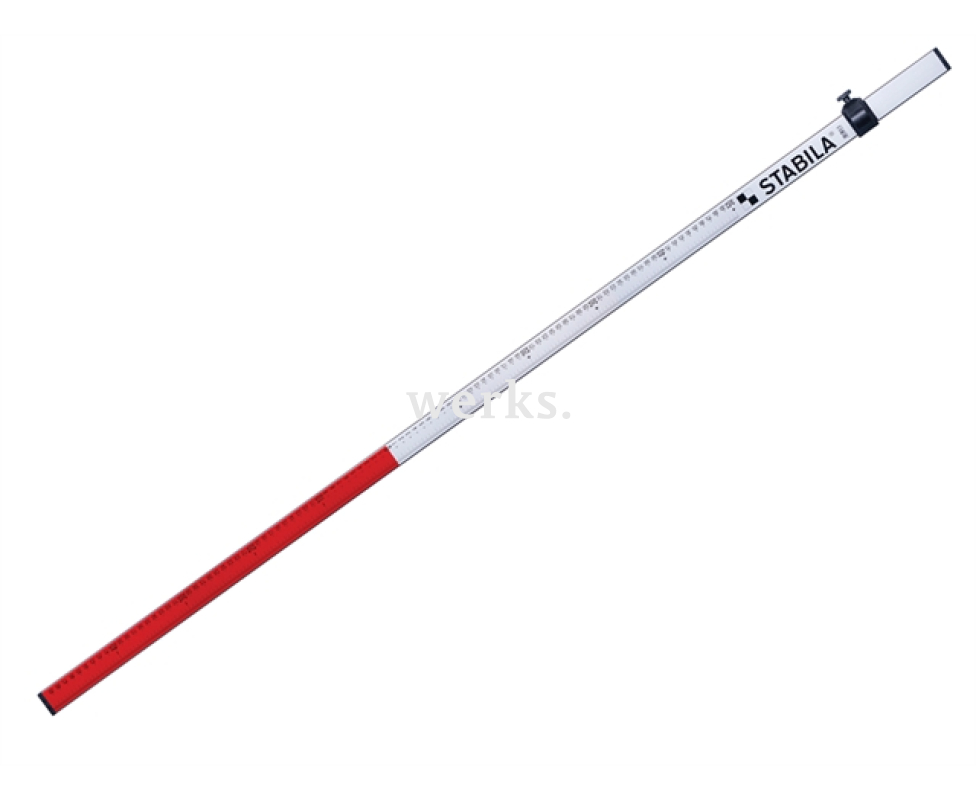 Изготовлена из анодированного алюминия. Оснащена выдвижной шкалой, достигающей 240 см, с делениями в миллиметрах. В комплект входит установочный суппорт. Обеспечивает быстрое и удобное считывание отклонений в пределах ±50 см относительно опорной плоскости при высоте от 80 до 190 см. Шкала имеет печатные деления в миллиметрах. Максимальная выдвижная длина составляет 240 см, а транспортировочная высота — 130 см. Используется для нивелирования на больших расстояниях с применением лазерных инструментов и ресиверов. Габариты в сложенном виде: длина 1200 мм, ширина 45 мм, толщина 45 мм. Порядок работы: - выровнять нулевую отметку рейки по лазерному лучу - переместить ресивер на нивелирной рейке для установки в новой измерительной точке на уровне лазерного луча - считать изменение высоты по шкале рейки.