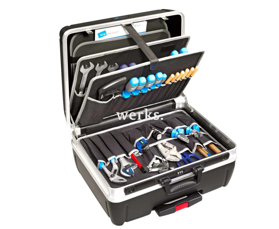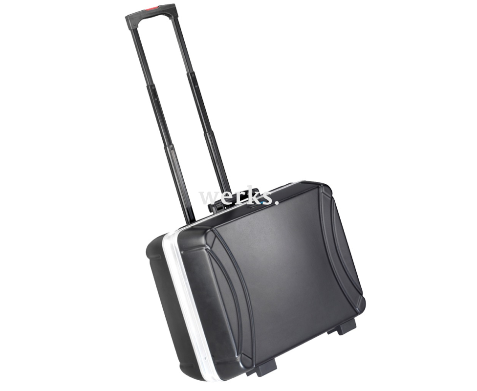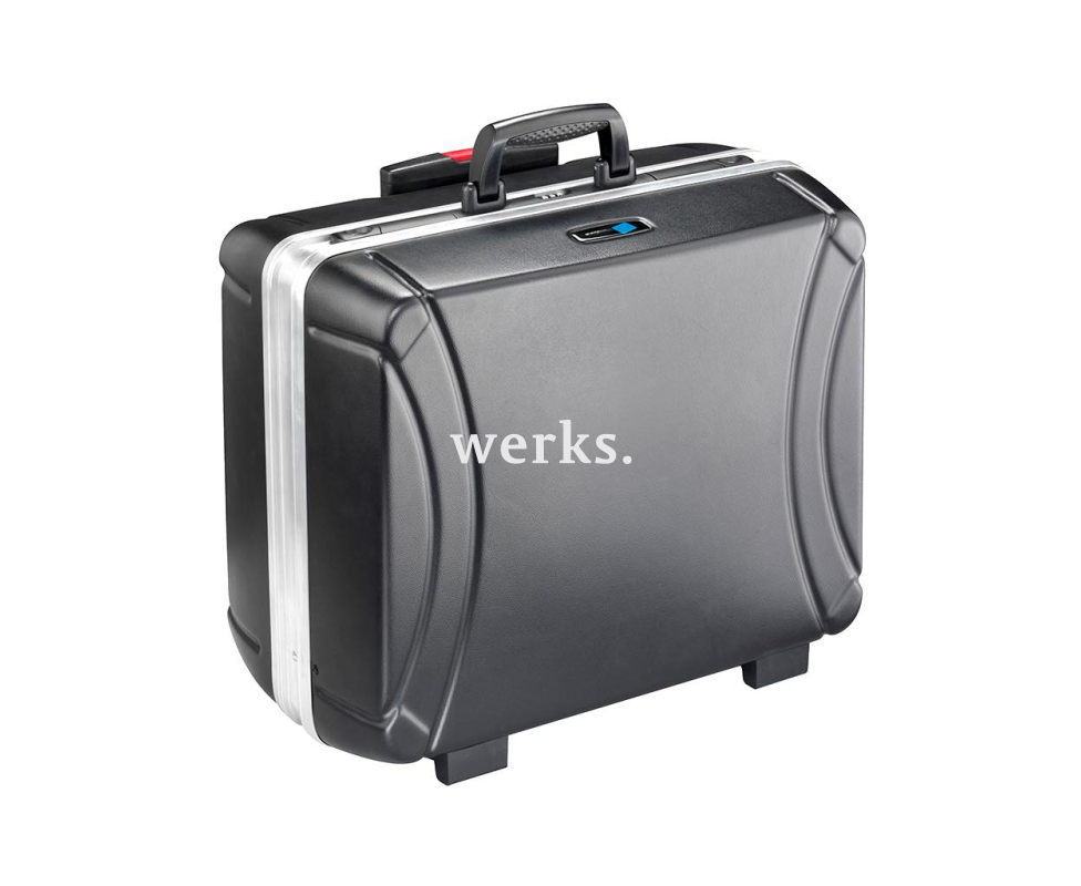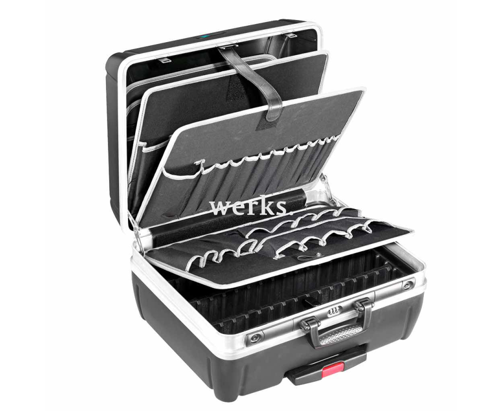 Изготовлен из прочного ударостойкого материала HDPE, на надежной алюминиевой раме с усиленными краями. Удобная ручка B&W CONVENIENCE. Телескопическая выдвижная рукоятка и плавный ход колес обеспечивают легкость перемещения и отличную мобильность. Идеально подходит для транспортировки в ручной клади самолета. Две съемные панели для инструментов, каждая из которых имеет 23 кармана. Съемная крышка нижнего отсека с 15 карманами для инструментов с одной стороны и шарнирным держателем. Два запираемых зажима и один кодовый замок B&W PROFIcode. Габариты составляют 505 х 440 х 280 мм. Объем 42 литра. Максимальная нагрузка - 35 кг.
