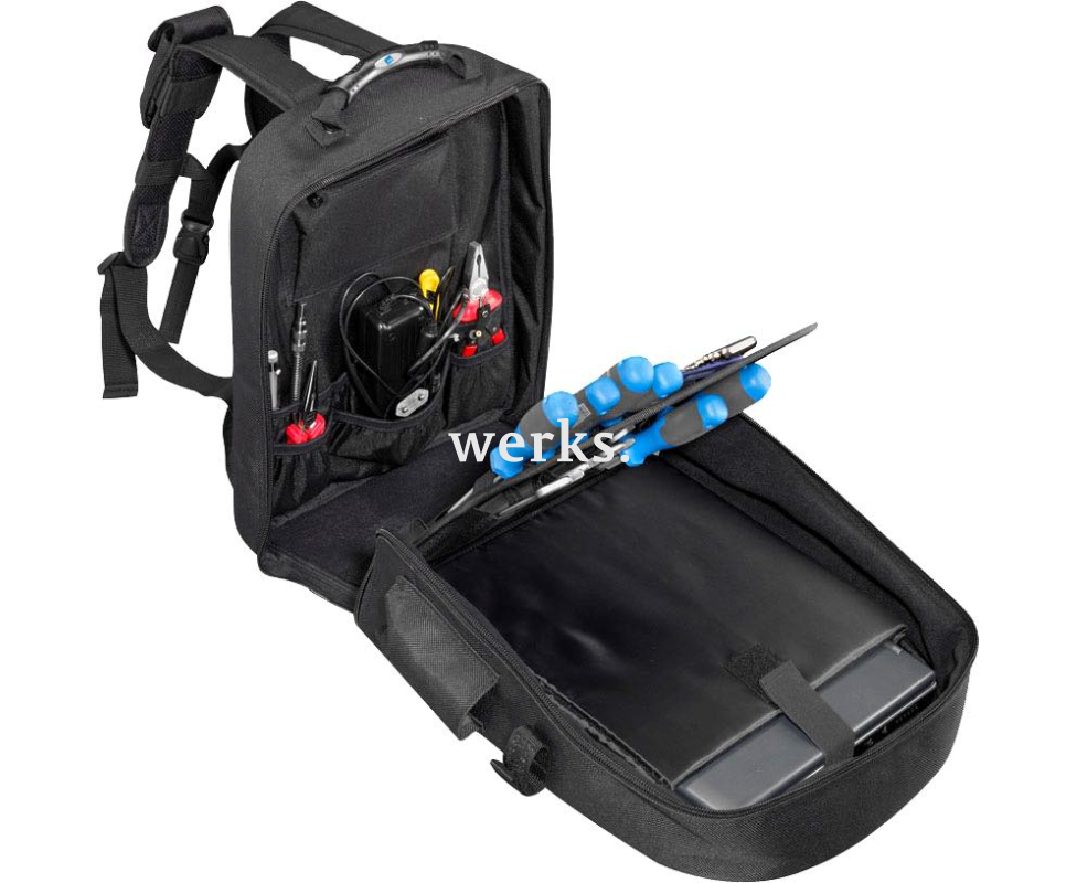 Изготовлен из прочного и устойчивого к износу нейлона, с водоотталкивающим дном. Оснащен регулируемыми плечевыми ремнями, поясными и грудными ремнями, а также эргономичной прорезиненной ручкой. Внутренняя панель съемная и включает карманы для инструментов. Передняя панель, складывающаяся на 90°, имеет отсек для ноутбука размером 15 дюймов, 16 карманов для инструментов на спинке и 2 ряда петель. Внутреннее разделение на отсеки предоставляет широкие возможности для транспортировки инструментов и других предметов. Спереди расположен накладной карман на молнии, а боковые карманы идеально подходят для бутылки с водой, кружки и других мелочей. Размеры составляют 350 х 430 х 230 мм. Максимальная нагрузка - 12 кг.