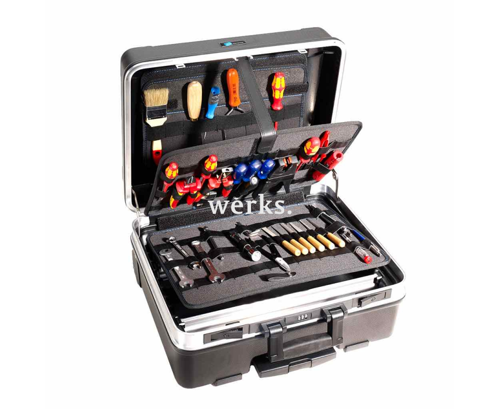 Изготовлен из прочного ударостойкого пластика ABS, на надежной алюминиевой раме с усиленными краями. Четыре дополнительные ножки обеспечивают стабильную установку на поверхности и защищают корпус от повреждений. Удобная и прочная ручка. Телескопическая выдвижная рукоятка и плавный ход колес гарантируют легкость перемещения и высокую мобильность. В крышке имеется перегородка для документов формата A4. Регулируемый нижний лоток включает 2 алюминиевых разделителя, 4 переходника и 2 крышки Middel. Съемная панель для инструментов в крышке содержит 22 кармана для инструментов с обеих сторон. Съемная крышка нижнего лотка имеет 15 карманов для инструментов. Два запираемых зажима и один кодовый замок B&W PROFIcode. Габариты составляют 515 х 445 х 200 мм. Объем 36 л. Максимальная нагрузка - 30 кг.