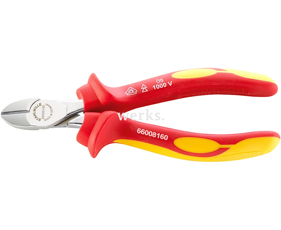 Профессиональные диэлектрические бокорезы Stahlwille длиной 160 мм с хромированным покрытием. Режущие кромки закалены индукционно до твердости HRC 63. Рукоятки выполнены из нескольких компонентов и имеют электроизоляцию. Эти инструменты безопасны для работы с узлами и деталями, находящимися под напряжением до 1 000 В переменного тока.