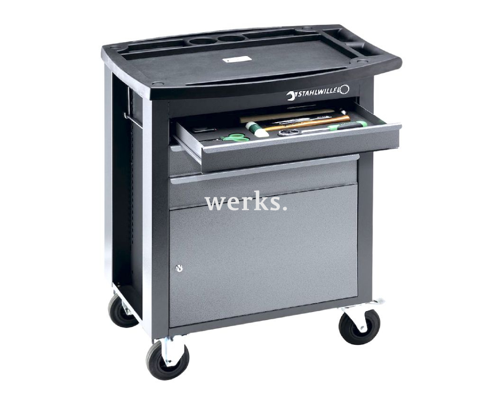 Тележка Stahlwille размером 780 х 540 x 933 мм. Оснащена тремя выдвижными ящиками, в которых находятся ложементы с 65 инструментами и прочной многоцелевой накладкой. Дверца с цилиндровым замком. В комплект входят разнообразные инструменты для обслуживания автомобильных узлов, резьбовых соединений и обработки заготовок. Ложементы изготовлены из масла- и кислотостойкого ABS-пластика. Колеса также устойчивы к маслу и кислотам, имеют защитные кожухи для подшипников и стояночный тормоз. Состав инструмента включает: - Поперечная рукоятка 1/2'; - Удлинители 1/2' - 52 мм, 130 мм, 255 мм; - Карданный шарнир 1/2'; - Трещотка 36 зубьев 1/2'; - Торцовые головки 1/2': 10; 11; 12; 13; 14; 15; 16; 17; 18; 19; 20; 21; 22; 24; 27; 30; 32 мм; - Шлицевые отвертки: 0,6х3,5х75 мм; 0,8х4,0х100 мм; 1,0х5,5х125 мм; 1,2х6,5х150 мм; - Крестовые отвертки PH1, 2, 3; - Комбинированные гаечные ключи: 6; 7; 8; 9; 10; 11; 12; 13; 14; 15; 16; 17; 18; 19; 21; 22; 24 мм; - Г-образные ключи НЕХ: 1,5; 2; 2,5; 3; 4; 5; 6; 8; 10 мм; - Газовый ключ 240 мм; - Комбинированные плоскогубцы 180 мм; - Бокорезы 160 мм; - Нейлоновый молоток 35 мм; - Слесарный молоток 500 г; - Плоское зубило 175 мм; - Выколотки: 150х6; 175х6; - Выколотка с направляющей втулкой 100х3,4.