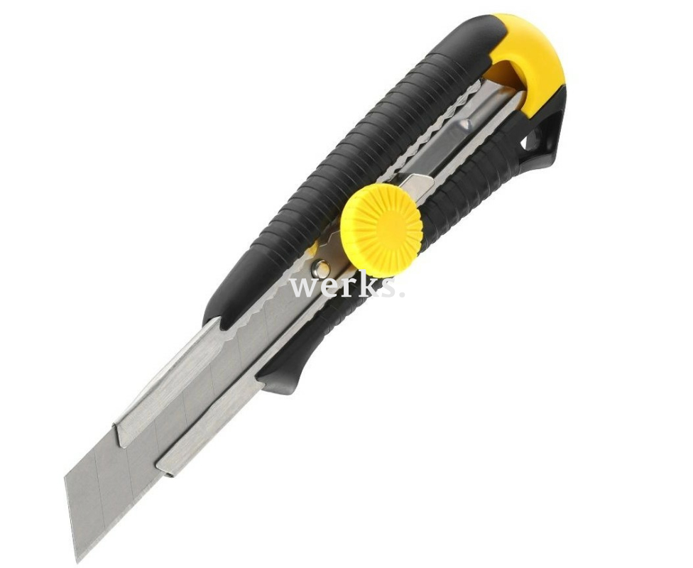 Монтажный нож Stanley 0-10-418 с выдвижным лезвием и функцией автоматической блокировки в 5 положениях предназначен для выполнения широкого спектра задач. Прочный корпус из цинкового сплава и стальной механизм подачи рассчитаны на интенсивные нагрузки. Эргономичная рукоятка с резиновыми вставками обеспечивает комфорт и контроль при резке плотных материалов. Встроенный отсек в рукоятке позволяет хранить 5 запасных лезвий стандартного типа.
