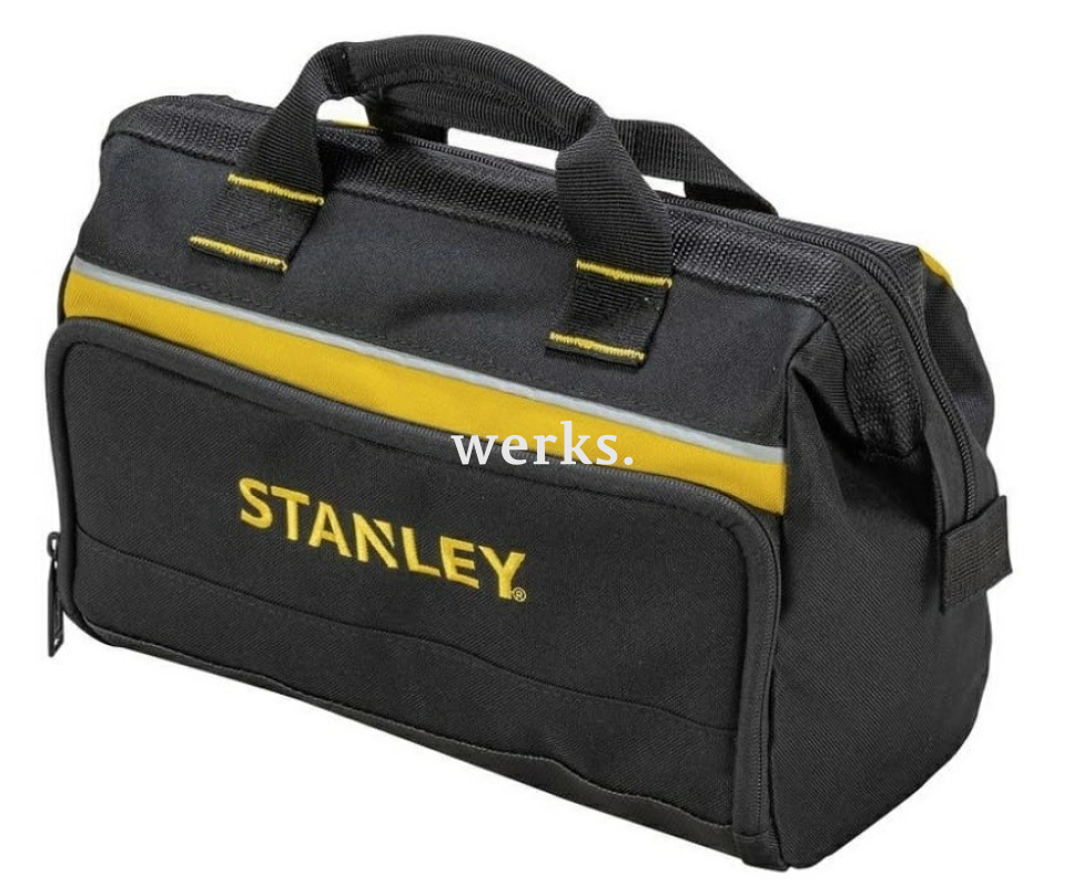 Сумка для инструментов Stanley из прочного нейлона с множеством карманов. Усиленные швы и металлическая фурнитура. Плечевой ремень и ручки для переноски.