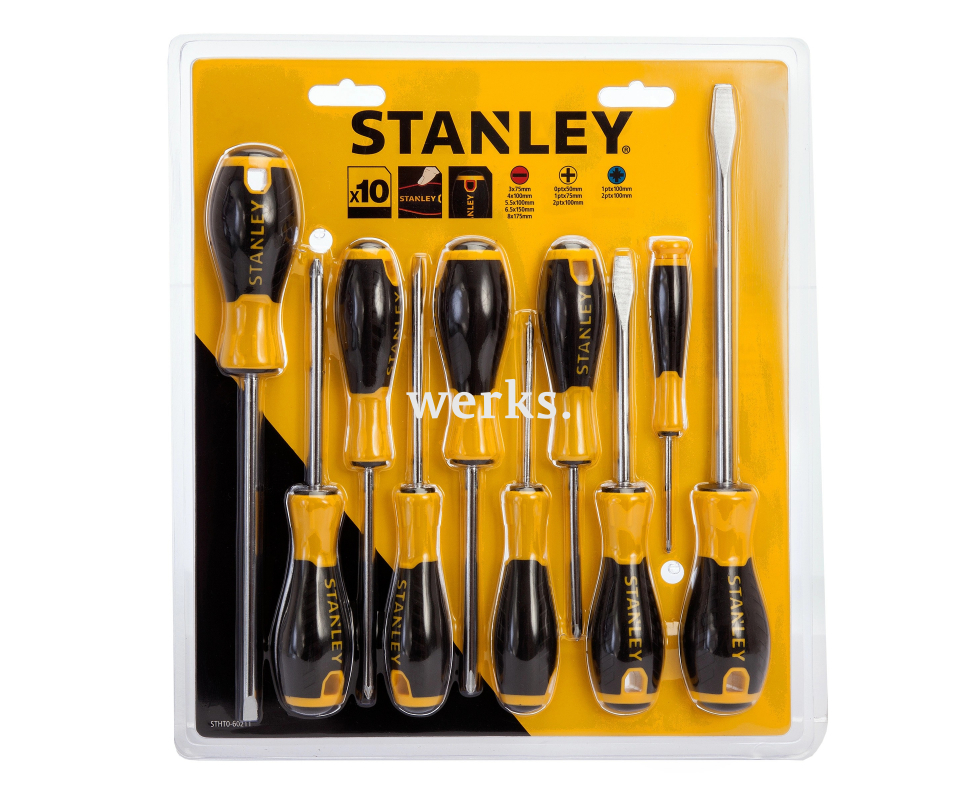 Набор отверток Stanley включает различные типы и размеры жал для профессионального использования. Стержни из хромованадиевой стали закалены и имеют защитное покрытие. Эргономичные рукоятки с зонами упора уменьшают усилие и повышают контроль.