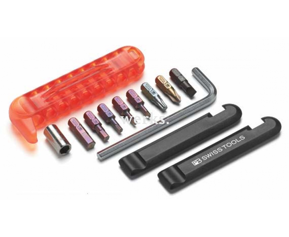 Набор из 8 сменных бит формы C6,3 1/4' PB Swiss Tools. В комплект входит Г-образный ключ-держатель бит (5 мм) и магнитный переходник-адаптер, а также два пластиковых рычага для снятия шин с велосипеда. Этот набор предназначен для работы с различными типами шлицов. Упакован в удобную и компактную кассету зеленого цвета. Отлично подходит для ремонта велосипеда и выполнения других мелких ремонтных работ. PB 470.Green