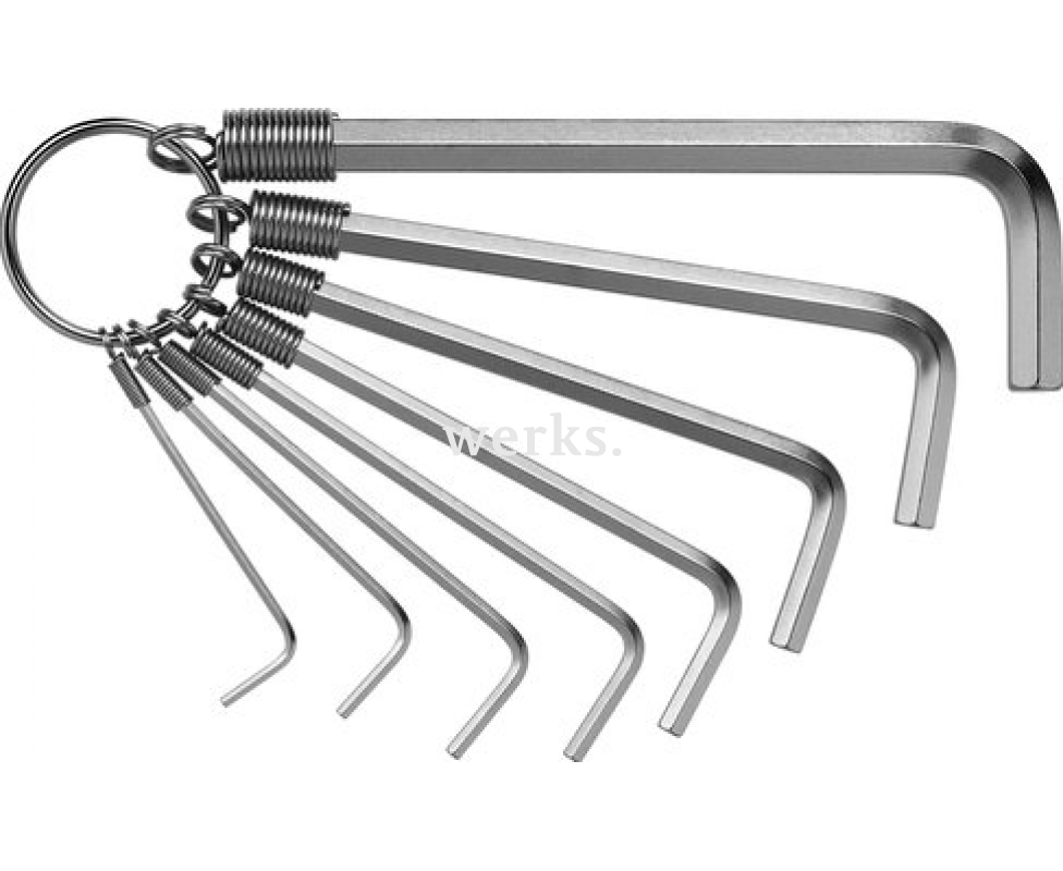 Комплект из 8 L-образных шестигранных ключей для винтов с внутренним шестигранником. Изготовлены из закаленной хромванадиевой стали и имеют полное хромовое покрытие. Удобно размещены на кольце. PB PB 210.D