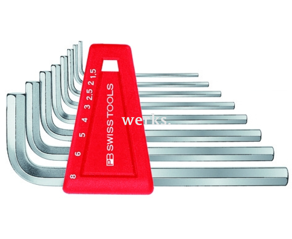 Комплект из 8 L-образных шестигранных ключей для винтов с внутренним шестигранником. Изготовлены из закаленной хромванадиевой стали и полностью хромированы. Упакованы в удобный кассетный держатель с указанием размеров ключей. PB 210.H-8