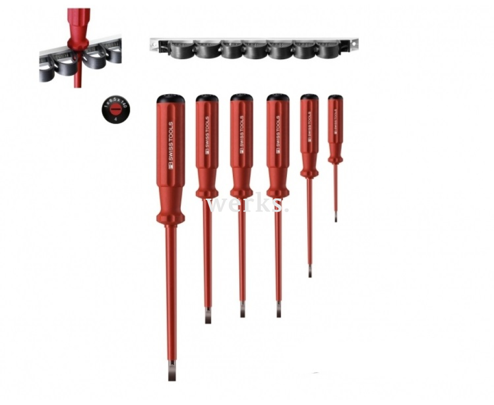 Набор из шести шлицевых диэлектрических отверток PB Swiss Tools PB 5560.CN различных размеров. Изготовлены из высококачественной стали с изоляционным покрытием. Идеально подходят для работы с компонентами и узлами, находящимися под напряжением до 1000 В AC / 1500 В DC. Имеют сертификаты VDE и IEC. Упакованы в блистер. В комплект входит крепление для настенного хранения.