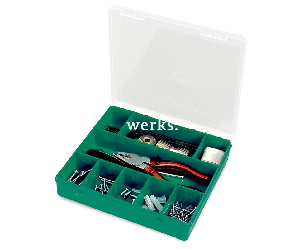 Полипропиленовый органайзер с прозрачной крышкой и девятью ячейками разных размеров для хранения мелких предметов и крепежа. Оснащен замком-защелкой. Размеры составляют 215х207х42 мм.
