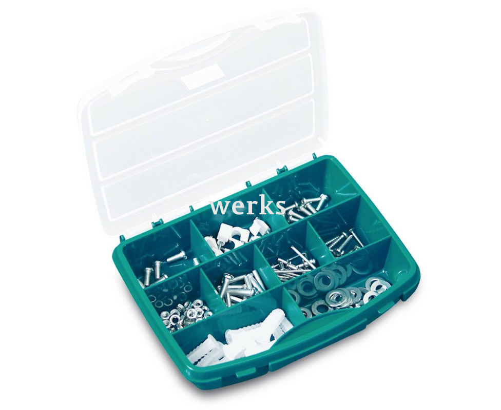 Полипропиленовый органайзер с прозрачной крышкой и девятью ячейками разных размеров для хранения мелких предметов и крепежа. Оснащен замком-защелкой. Размеры составляют 190х150х42 мм.