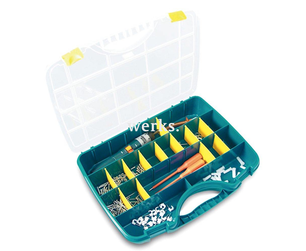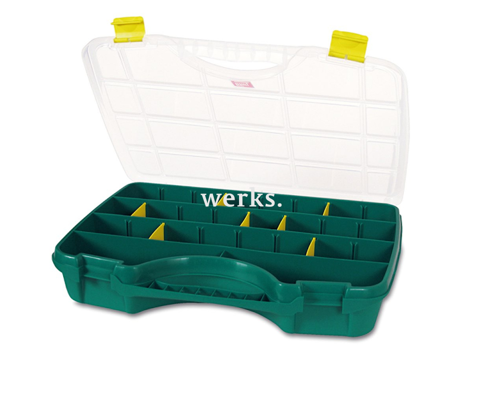 Полипропиленовый органайзер с прозрачной крышкой и 26 ячейками разных размеров. Оснащен специальными пазами для 21 подвижной перегородки, позволяющими регулировать длину ячеек. Имеет два замка-защелки. Размеры составляют 460х350х81 мм.