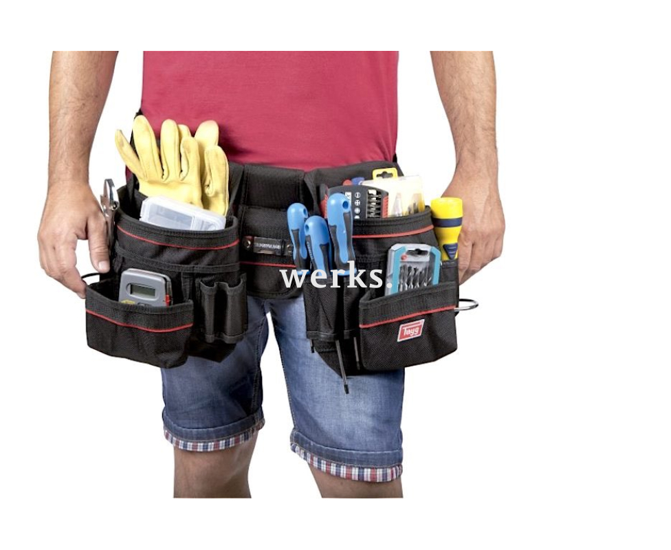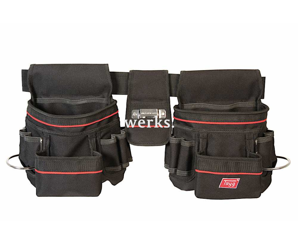 Удобная и надежная сумка, изготовленная из прочного полиэстера (нейлона). В ней имеются два подсумка, каждый из которых оборудован несколькими карманами для расходных материалов и мелкого инструмента, а также петлями для отверток и металлическими держателями для молотка. Оснащена регулируемым поясным ремнем с застежкой типа фастекс.