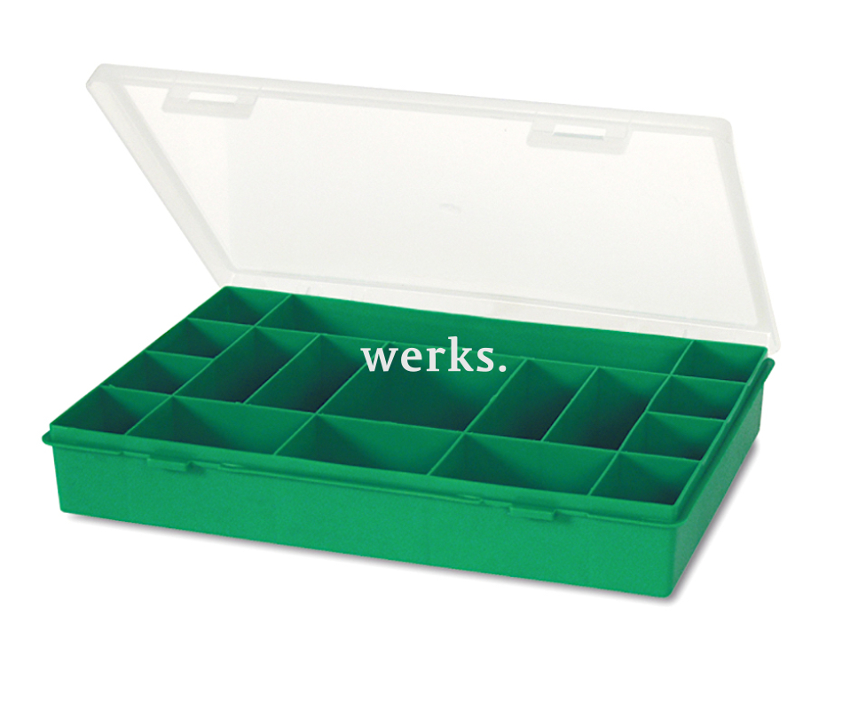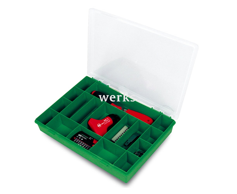Полипропиленовый органайзер с прозрачной крышкой и 17 ячейками разных размеров для хранения инструментов, деталей и крепежа. Оснащен двумя защелками. Размеры составляют 330х247х54 мм.