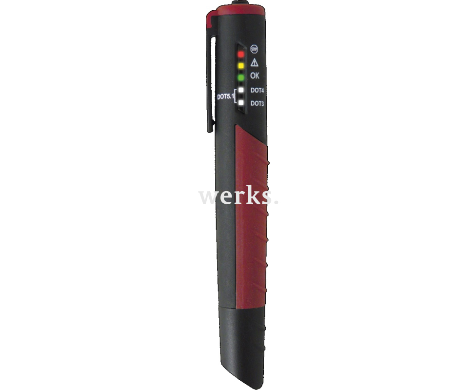 Компактный и практичный тестер в виде ручки с зажимом для крепления на кармане. Оснащен подсветкой для удобства измерений. Быстро определяет качество тормозной жидкости DOT 3, DOT 4, DOT 5.1. Уровень влаги в тормозной жидкости на основе гликоля отображается с помощью трех светодиодов. Корпус устройства устойчив к ударам и выполнен из термо- и кислотостойких материалов. Этот прибор идеально подходит для проверки качества тормозной жидкости после обслуживания автомобиля в автосервисе. Степень защиты - IP 40. Питание осуществляется от двух батарей AAA 1.5 В.