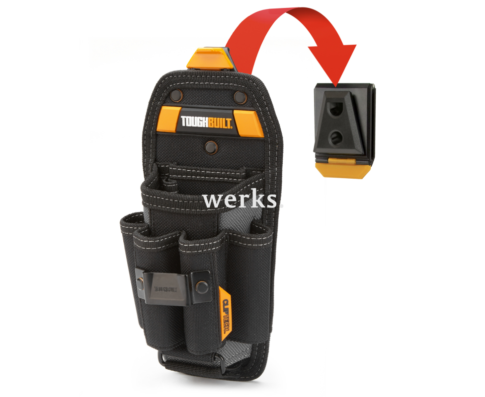 Центральный отсек кобуры имеет оригинальное съемное дно, а также включает 4 петли для отверток, карман для записной книжки, петлю для карандаша и зажим для рулетки. Подсумок можно прикрепить к любому ремню шириной до 5 см с помощью фирменной клипсы ClipTech™ Hub™.