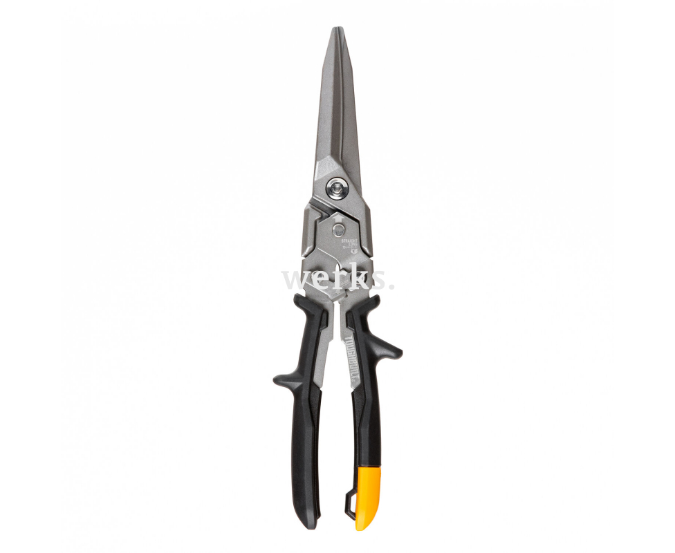 Предназначены для выполнения непрерывных прямых резов. Кованые лезвия с индукционно закаленными режущими кромками сохраняют остроту в 10 раз дольше по сравнению с литыми аналогами. Эргономичная форма рукоятки позволяет резать в двух позициях: задним хватом для максимального рычага и усилия, а также передним хватом для лучшего контроля. Поворотный болт, установленный заподлицо, не будет мешать материалу во время резки. Металлический замок надежно фиксирует инструмент при хранении и может быть легко зафиксирован одной рукой. Эти ножницы разработаны для удовлетворения высоких требований профессионалов. Они предназначены для резки холоднотканной стали толщиной до 1,2 мм и нержавеющей стали до 0,7 мм.