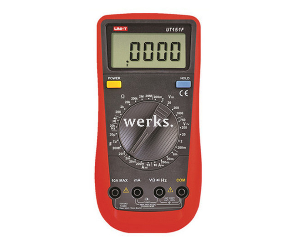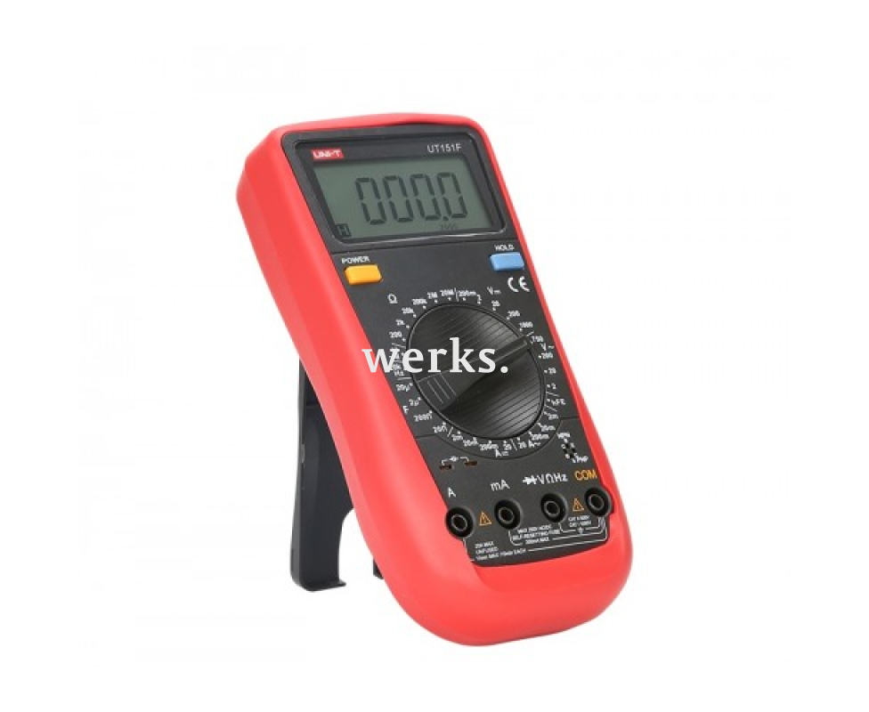 Надежный, безопасный и точный цифровой мультиметр. Он позволяет измерять постоянный и переменный ток, постоянное и переменное напряжение, сопротивление, ёмкость, частоту, а также проводить прозвонку цепей и тестирование диодов. Устройство имеет ручной выбор диапазона измерений и 4-разрядный ЖК-дисплей с подсветкой. Индикация разряда батареи и функция сохранения показаний (HOLD) делают его удобным в использовании. Прибор автоматически отключается при простое. В конструкции применены интегральные микросхемы, двойной интегральный преобразователь для переменного и постоянного тока, а также система защиты от перегрузок. В комплект входят щупы, батарейка и инструкция. Напряжение постоянного тока - 200 мВ/2/20/200/1000 В (±0,05%±3) Напряжение переменного тока - 2/20/200/750 В (±0,5%±1) Постоянный ток - 2/200 мА/20 А (±0,5%±5) Переменный ток - 2/200 мА/20 А (±0,8%±10) Электрическое сопротивление - 200 Ω/2/20/200 KΩ/2/20 МΩ (±0,3%±1) Электроемкость - 20/200 нФ/2/200 мкФ (±4,0%±20) Частота - 20 КГц (±1,5%±5) Питание - 1 х 9 В батарейка 6F22 (типа Крона) Размеры - 186 x 91 x 39 мм Вес - 300 г. Прибор используется для измерения постоянного и переменного тока, напряжения, сопротивления, ёмкости, частоты, тестирования диодов и прозвонки цепей.