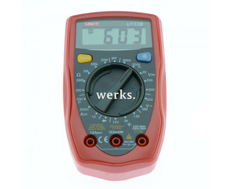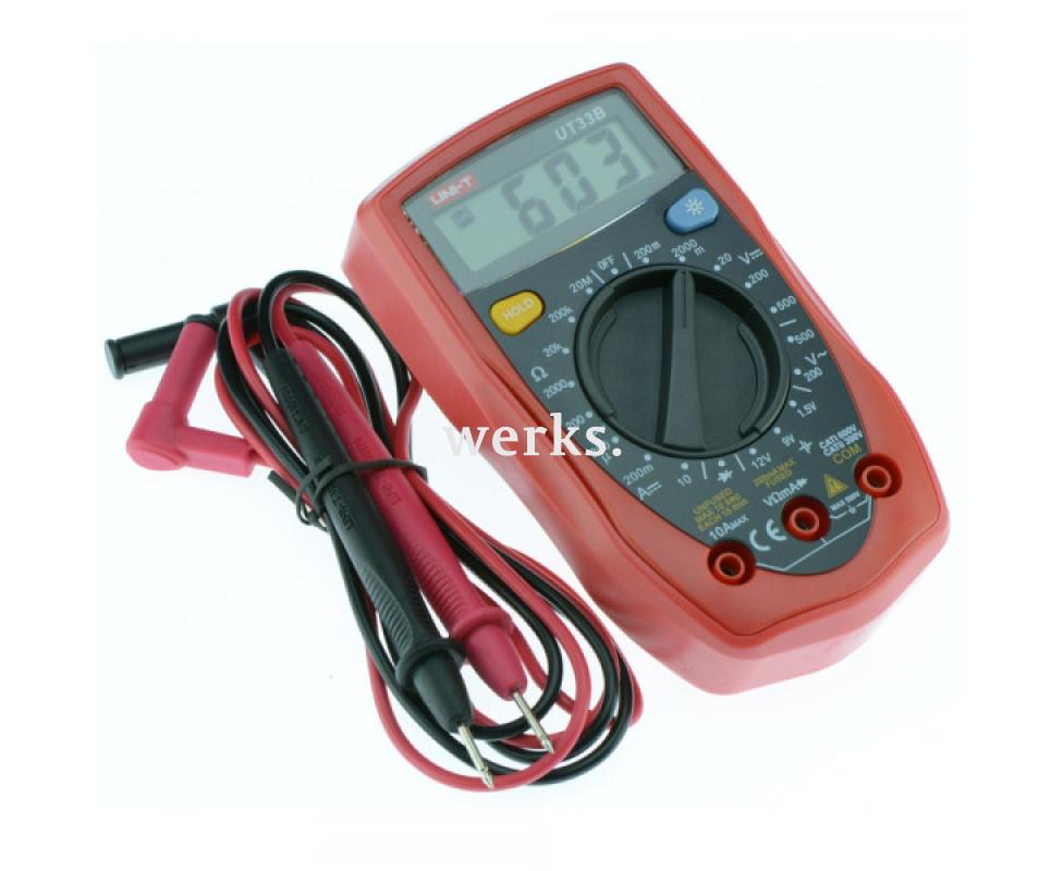 Надежный, безопасный, компактный и точный цифровой мультиметр. Несмотря на свои небольшие размеры, он способен выполнять измерения постоянного тока, а также постоянного и переменного напряжения, сопротивления, проводить прозвонку цепей и тестирование диодов. Имеет ручной выбор диапазона измерений. Оснащен 4-разрядным ЖК-дисплеем с подсветкой, индикацией разряда батареи и функцией сохранения показаний (HOLD). Автоматическое отключение питания при бездействии. В комплект входят два щупа, батарея и инструкция. Напряжение постоянного тока - 200/2000 мВ/20/200/500 В (±0,5%±2) Напряжение переменного тока - 200/500 В (±1,2%±10) Постоянный ток - 2000 мкА/200 мА/10 А (±1,0%±2) Электрическое сопротивление - 200 Ω/2/20/200 KΩ/20 МΩ (±0,8%±2) Питание - 1 х 9 В батарея 6F22 (типа Крона) Размеры - 130 x 73 x 35 мм Вес - 156 г. Применяется для измерения постоянного тока, постоянного и переменного напряжения, сопротивления, тестирования диодов, прозвонки цепей и проверки состояния батарей 1,5; 9; 12 В.
