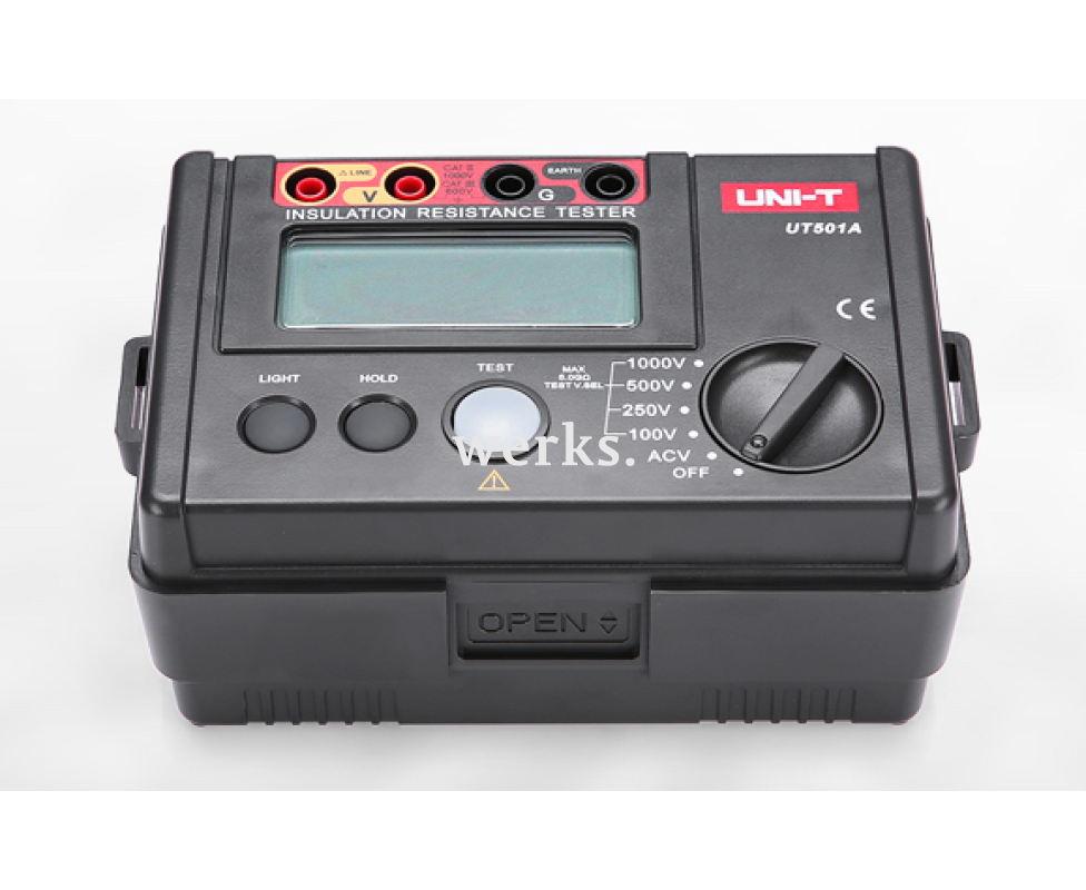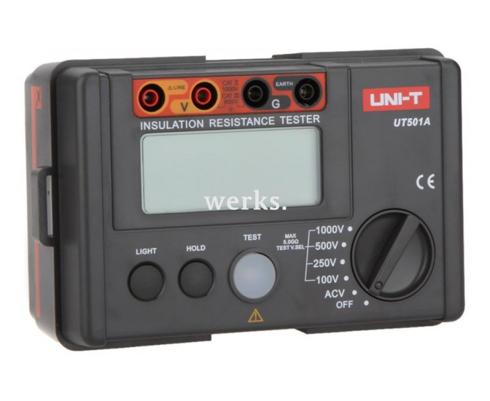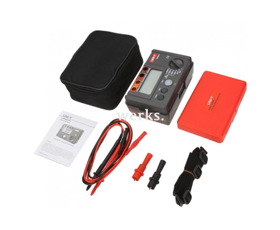 Цифровой измеритель сопротивления изоляции. Оснащен крупным 4-разрядным ЖК-дисплеем с подсветкой. Автоматически выбирает диапазон измерений. Уведомления о разряде батареи, а также о наличии опасного напряжения (световые и звуковые сигналы) и перегрузке. Функция автоотключения при бездействии. В комплект входят 6 батареек, набор щупов, зажимы 'крокодил', сумка с наплечным ремнем и инструкция. Тестовое напряжение - 100/250/500/1000 В Измерение сопротивления изоляции: - 100 В - 0 ~ 100 MΩ (±3%±5) - 250 В - 0 ~ 99,9 MΩ (±3%±5); 100 MΩ - 5,5 GΩ (±5%±5) - 500 В - 0 ~ 99,9 MΩ (±3%±5); 100 MΩ - 5,5 GΩ (±5%±5) Ток короткого замыкания - <2 мА Измерение переменного напряжения - 30 ~ 750 В (±2%±3) Питание - 6 х 1,5 В батареек АА Размеры - 150 х 100 х 71 мм Вес - 500 г. Предназначен для точного и быстрого измерения сопротивления изоляции, переменного напряжения и прозвонки цепей.