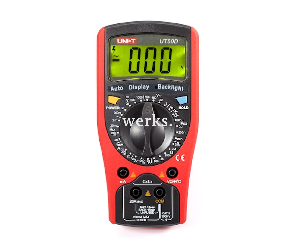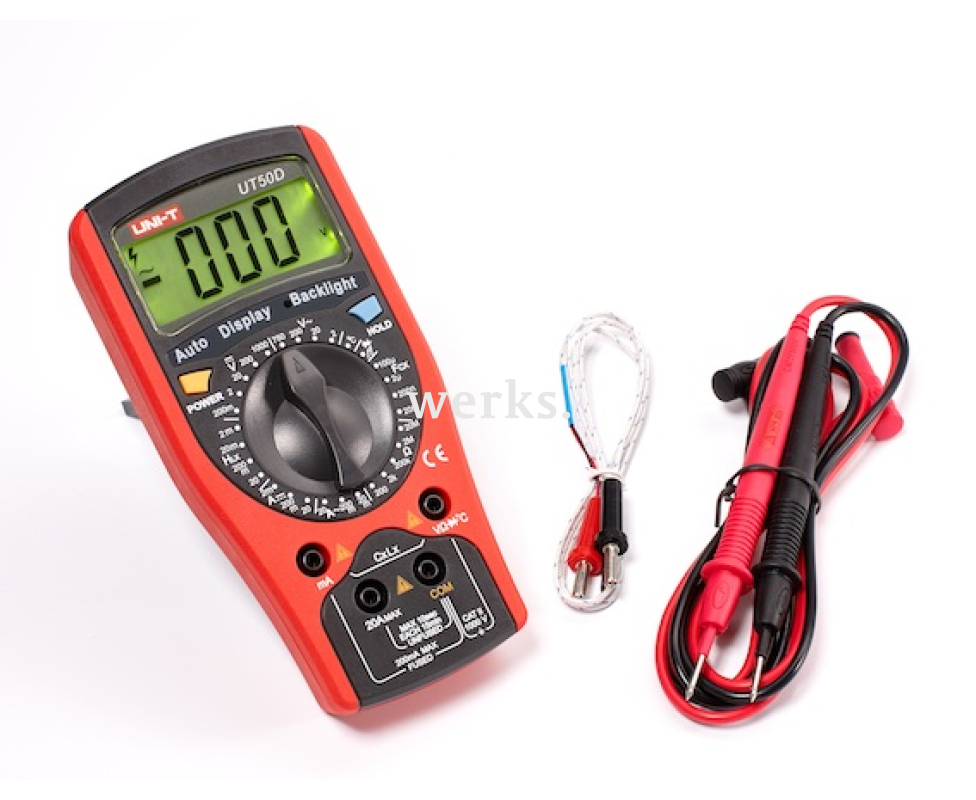 Надежный, безопасный и точный цифровой мультиметр. Он позволяет измерять постоянный и переменный ток, постоянное и переменное напряжение, сопротивление, ёмкость, температуру и индуктивность, а также выполнять прозвонку цепей и тестирование диодов. Устройство имеет ручной выбор диапазона измерений и 3,5-разрядный ЖК-дисплей с подсветкой. Индикация разряда батареи, функция сохранения показаний (HOLD) и автоматическое отключение питания при простое. В комплект входят щупы, термопара, батарейка и инструкция. Напряжение постоянного тока - 200 мВ/2/20/200/1000 В (±0,5%±1) Напряжение переменного тока - 2/20/200/750 В (±0,8%±3) Постоянный ток - 2/200 мА/20 А (±0,8%±1) Переменный ток - 20/200 мА/20 А (±1,0%±3) Электрическое сопротивление - 200 Ω/2/200 KΩ/2/20 МΩ (±0,8%±1) Ёмкость - 20/200 нФ/2/100 мкФ (±2,5%±5) Индуктивность - 2/20/200 мГн/20 Гн (±2,0%±10) Температура - -40°C ~ +1000°C (±1,0%±3) Питание - 1 х 9 В батарейка 6F22 (типа Крона) Размеры - 165 x 80 x 38 мм Вес - 275 г. Прибор используется для измерения постоянного и переменного тока, напряжения, сопротивления, ёмкости, температуры и индуктивности, а также для прозвонки цепей и тестирования диодов.