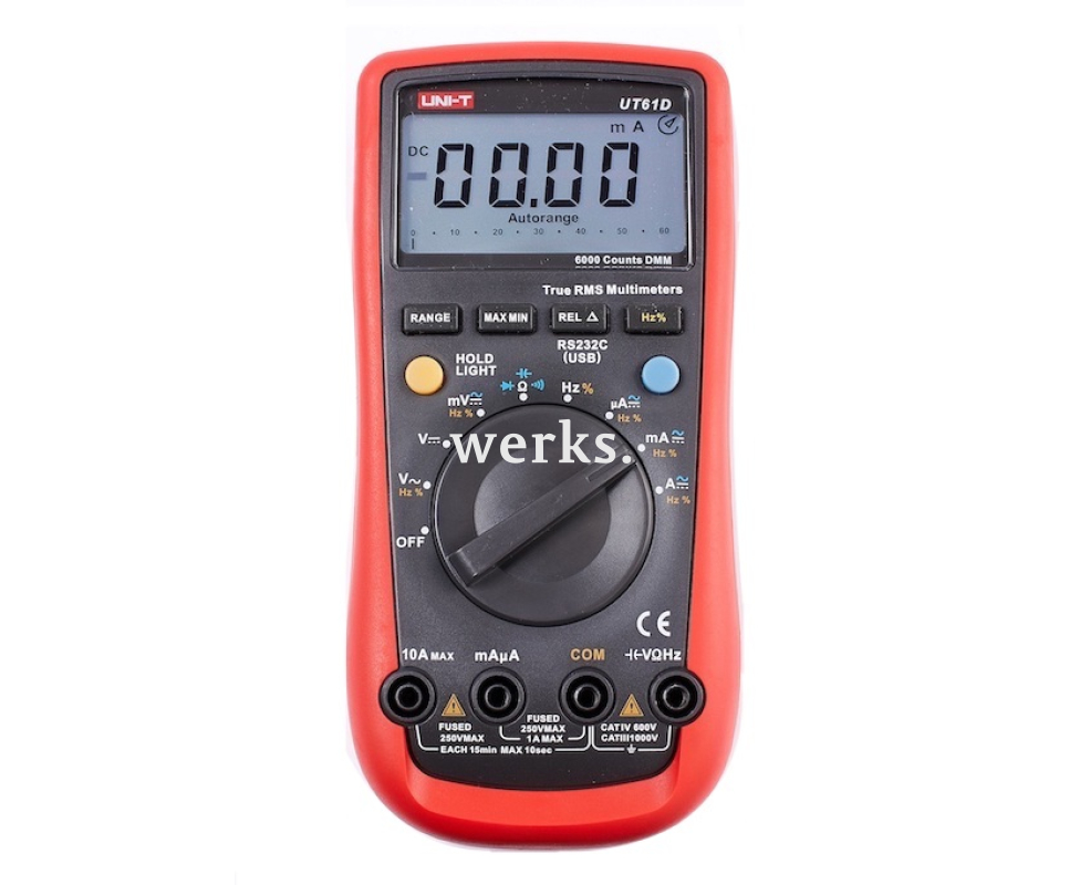 Надежный, безопасный и точный цифровой мультиметр. Он позволяет измерять силу постоянного и переменного тока, напряжение, сопротивление, электроемкость, частоту, а также проводить прозвонку цепей и тестирование диодов. Автоматический выбор диапазона измерений. 4-разрядный ЖК-дисплей с подсветкой и аналоговая шкала на 61 деление. Индикация перегрузки, неправильной полярности и разряда батареи. Функция сохранения показаний (HOLD), режимы MAX/MIN. Автовыключение при простое. Возможность относительных измерений и режим измерения истинных среднеквадратических значений. В комплект входят щупы, кабель для порта RS232C, батарейка, программное обеспечение и инструкция. Напряжение постоянного тока - 60 мВ ~ 1000 В (±0.5%±1) Напряжение переменного тока - 60 мВ ~ 750 В (±1,0%±3) Сила постоянного тока - 600 мА ~ 10 А (±1,0% ±3) Сила переменного тока - 600 мА ~ 10 А (±1,2% ±5) Электроемкость - 40 нФ ~ 4000 мкФ (±3.0%±5) Электрическое сопротивление - 600 Ω ~ 60 МΩ (±1.0%±2) Частота - 10 Гц ~ 10 МГц (±0.1%±4) Питание - 1 х 9 В батарейка 6F22 (типа Крона) Размеры - 180 x 87 x 47 мм Вес - 370 г. Инструмент предназначен для измерения величин постоянного и переменного тока, напряжения, сопротивления, электроемкости, частоты, тестирования диодов и прозвонки цепей.