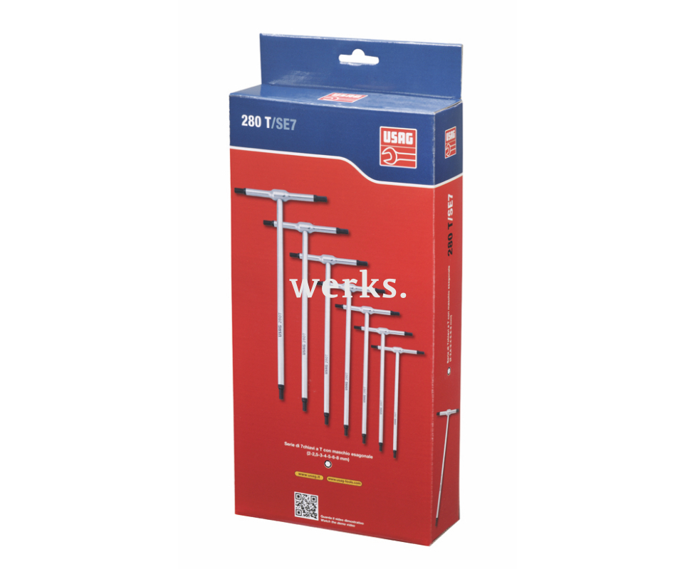 Набор Т-образных штифтовых ключей USAG серии 280 T включает 7 инструментов с размерами от 2 до 8 мм (2-2,5-3-4-5-6-8). Ключи данной серии выполнены из хромо-ванадиевой стали и имеют хромированное покрытие с воронёным наконечником длиной 8 мм, что гарантирует точность размеров инструмента.