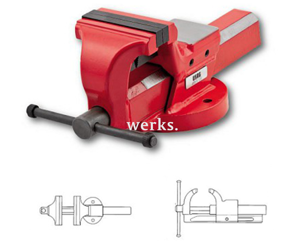 Стальные тиски с параллельными зажимными губками USAG 498 B U04980014. Задняя губка имеет наковальню. Инструмент оборудован двумя призматическими направляющими и винтами для настройки параллельности губок и устранения зазоров. Габариты инструмента составляют 460x227x183 мм, а размеры зажимной части - 150x200x94 мм. В комплект входит зажим для труб.