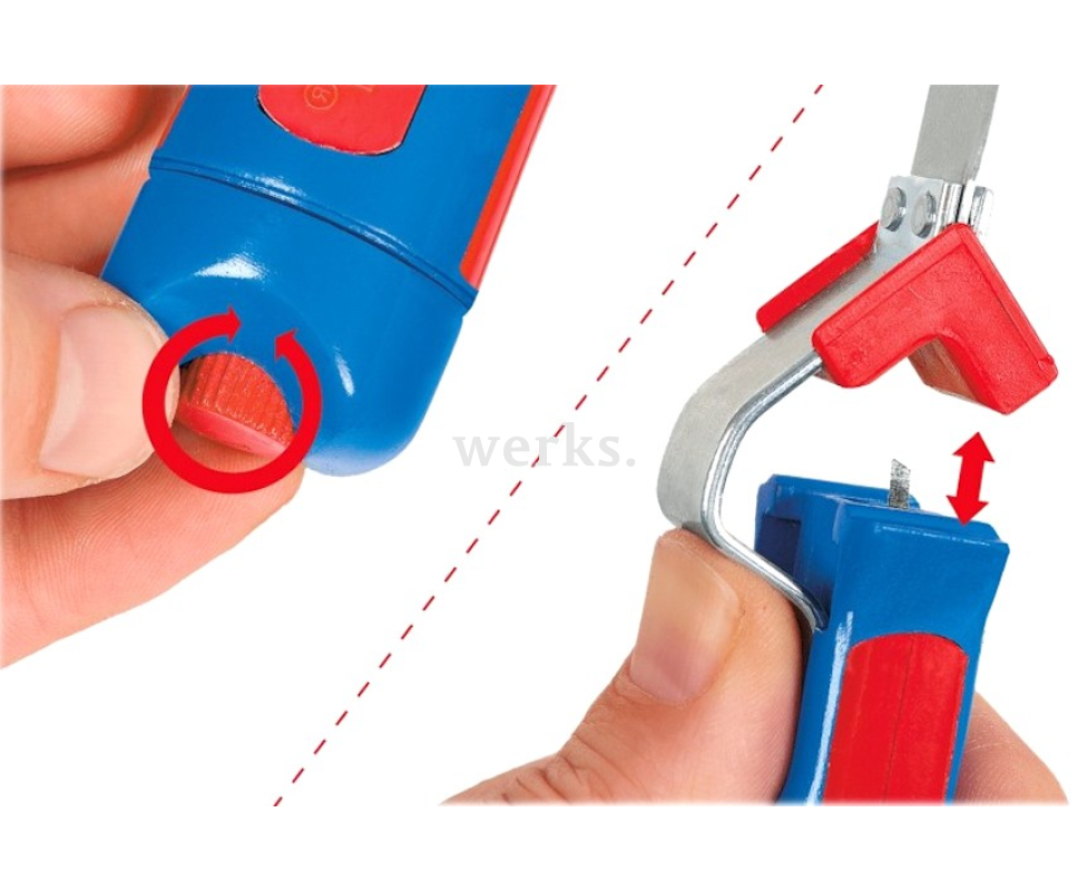 Кабельный нож, предназначенный для снятия изоляции с круглых тонкожильных и массивных кабелей с ПВХ-оболочкой диаметром от 8 до 27 мм, обеспечивает защиту внутренних проводников и изоляции. Регулируемый винт на задней части инструмента позволяет точно настраивать глубину реза. Внутри устройства находится вращающееся эксцентриковое лезвие, которое автоматически адаптируется для выполнения как поперечных, так и продольных резов. Корпус изготовлен из прочного полиамида с добавлением стекловолокна для повышения прочности. Поставляется в упаковке типа блистер. Сменное эксцентриковое лезвие - WCN50100001. WCN50050227
