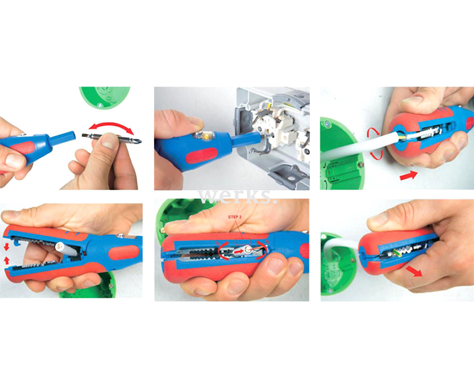Многофункциональный стриппер WCN51000500 предназначен для быстрого и точного удаления внешней оболочки с круглых кабелей диаметром от 8 до 13 мм и сечением от 0,5 до 6 мм² (AWG 10 до 20). Он эффективно снимает наружную оболочку и изоляцию с различных типов коаксиальных кабелей диаметром от 4,8 до 7,5 мм. Устройство оснащено встроенным резаком, который позволяет резать круглые кабели с ПВХ-изоляцией диаметром до 9 мм, не повреждая внутренние гибкие жилы. В комплект входят две встраиваемые крестовые биты PZ1 и PZ2, а также пробник напряжения с диапазоном 110 до 250 В. Корпус стриппера выполнен из прочного полиамида, армированного стекловолокном, а эргономичная рукоятка с мягкими вставками обеспечивает комфорт в использовании. Упаковка — блистер.