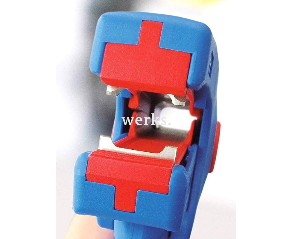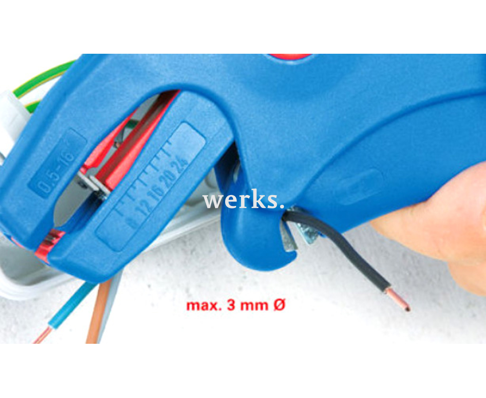 Автоматические стрипперы предназначены для быстрого и точного удаления изоляции с двух- и трехжильных плоских силовых кабелей, а также для снятия ПВХ изоляции с проводников таких кабелей с сечением от 0,75 до 4 мм². Инструмент также подходит для удаления изоляции с жил и оболочки круглых кабелей с сечением от 0,5 до 16 мм². Для снятия оболочки кабелей с сечением от 10 до 16 мм² требуется предварительный надрез, который выполняется вращением инструмента на 90°. Пятипозиционный переключатель позволяет оптимально настроить инструмент для работы с кабелями различного сечения в указанном диапазоне, не повреждая внутренние гибкие проводники. Корпус изготовлен из прочного полиамида, армированного стекловолокном. Длина снимаемой изоляции регулируется с помощью ручного упора. В комплекте имеется боковой резак для проводов диаметром до 3 мм. Инструмент поставляется в блистерной упаковке. Набор сменных лезвий - WCN51100007. WCN51001007