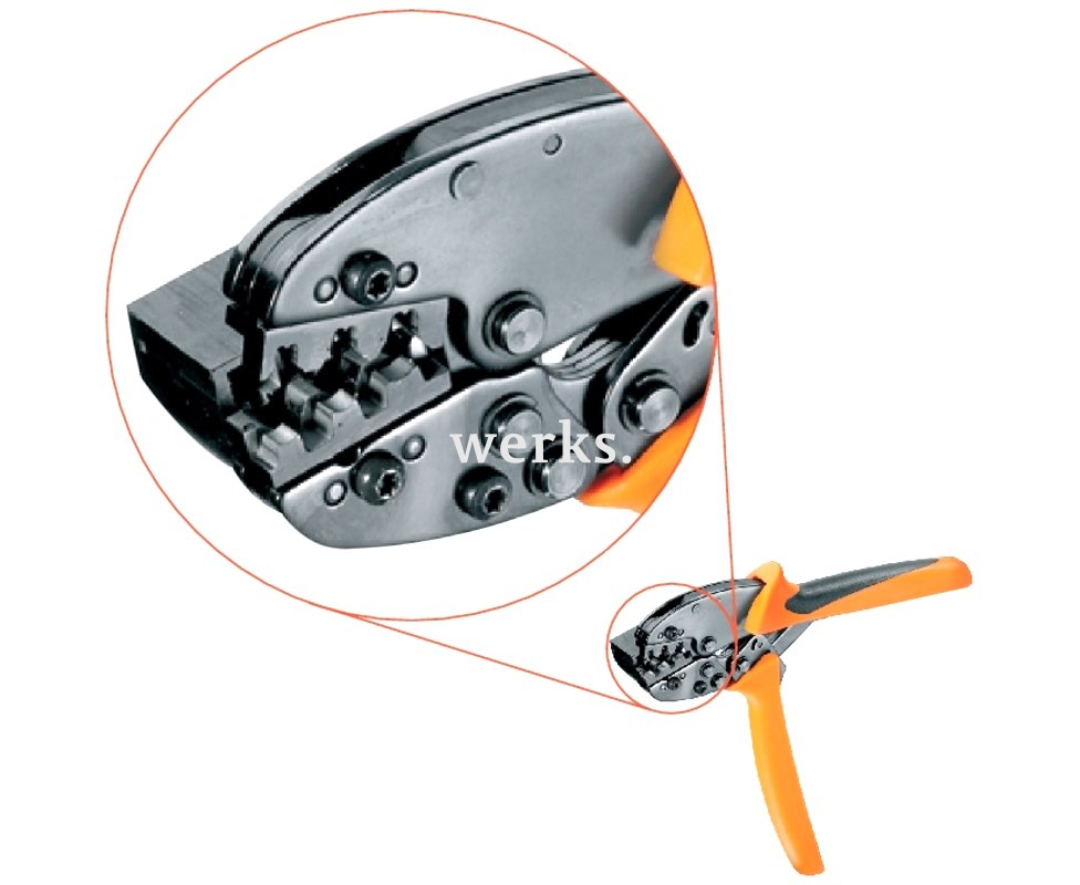 Профессиональные клещи для опрессовки длиной 250 мм предназначены для неизолированных плоских штекеров и разъемов с обхватывающим зажимом. Контактный тип - F-вилочная и розеточная часть. Инструмент поддерживает три профиля обжима В-crimp: 0,5 - 1,0 кв. мм; 1,5 - 2,5 кв. мм; 2,6 - 6 кв. мм. Опрессовка осуществляется методом закатывания. Оснащены храповым механизмом. Принудительная блокировка обеспечивает надежный обжим. В случае ошибки возможна разблокировка. Корректность обжима гарантируется специальным механизмом с собачкой, который позволяет открыть инструмент только по завершении полного цикла опрессовки. Двухкомпонентные пластиковые рукоятки обеспечивают удобство, а упор помогает точно позиционировать контакты.