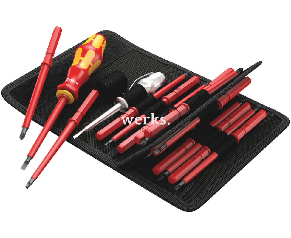 Ручной держатель 817 VDE Kraftform предназначен исключительно для использования с заменяемыми стержнями WERA VDE. Сменные рабочие концы VDE имеют длину 154 мм. В комплект входит однополюсный индикатор напряжения. Набор состоит из 16 элементов, включая изолированные отвертки SL, PH, PZ, PZ/S и TORX Wera Kraftform Kompakt VDE 60 i/65 i/67 i/16 с индикатором напряжения. В набор входят 14 сменных VDE жал (154 мм), ручка-держатель и однополюсный пробник, все упаковано в прочную поясную сумку.