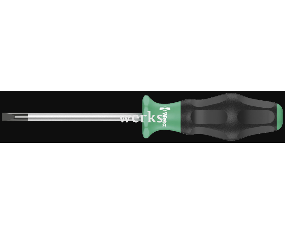 Отвертка Wera WE-031404 с высоким качеством, шлицевым профилем 3,0 мм, шириной шлица 0,5 мм, длиной жала 200 мм и диаметром 3,0 мм, имеет матово никелированное жало и рабочий наконечник Black Point.