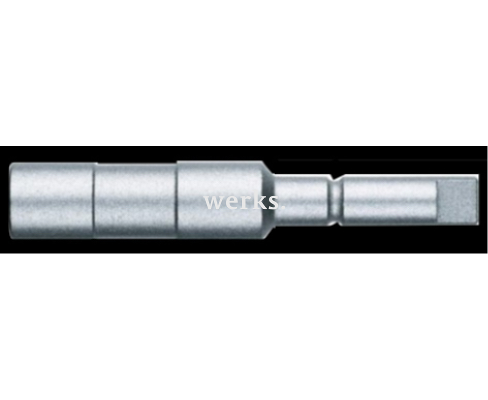 Универсальный держатель 890/8/1 K с магнитом и стопорным кольцом WE-052475 имеет длину 65 мм и диаметр рабочей части 11,1 мм. Он оснащен гнездом для бит 1/4' и шестигранным приводом 1/4', а также пружинным стопорным кольцом.