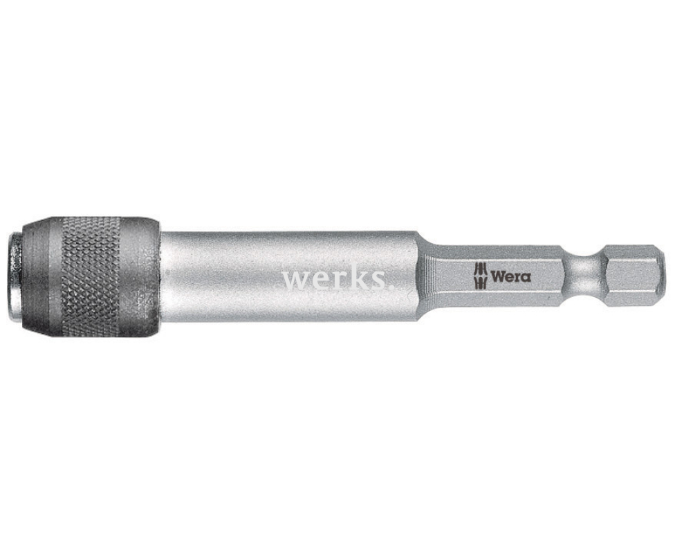 Универсальный держатель WE-053520 профессионального класса, длиной 75 мм и диаметром рабочей части 14,3 мм, оснащен гнездом для бит 1/4' и шестигранным приводом 1/4'. Быстрозажимной патрон делает его совместимым с насадками по стандарту DIN 1173-C 6,3 и различными соединениями Wera 1.