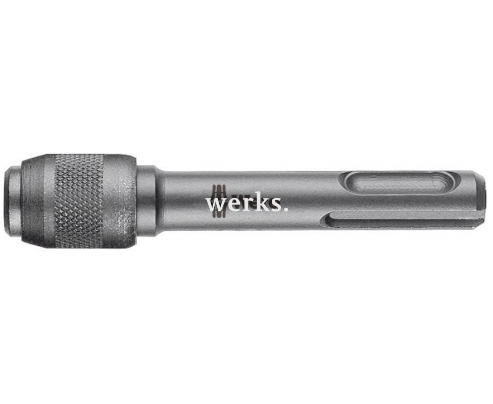Профессиональный универсальный держатель WE-053560 длиной 75 мм и диаметром рабочей части 14,3 мм, оснащённый гнездом для бит 1/4' и приводом SDS plus. Он включает пружинное стопорное кольцо и быстросменный патрон, что делает его совместимым с насадками по стандарту DIN 1173-C 6,3 и рядом подключений Wera 1.