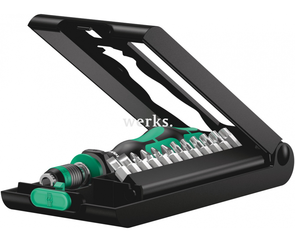 Набор Wera Kraftform Kompakt состоит из 14 элементов, включая 12 бит длиной 25 мм с штифтовым рабочим концом. Телескопическая вставка, встроенная в ручку и оснащенная быстрозажимным патроном, обеспечивает эффективную работу в ограниченных и неудобных пространствах. Вставку можно легко выдвинуть, нажав на блокирующую гильзу, а повторное нажатие с большей силой активирует механизм отсоединения. Телескопическую вставку можно извлечь для использования в качестве машинного адаптера или вернуть обратно в ручку. Профессиональный набор насадок Kraftform Kompakt 50 (SL, PH, PZ, TX BO), артикул WE-056656, включает 14 предметов, упакованных в прочный пластиковый кейс. Держатель бит Kraftform с быстрозажимным патроном Rapidaptor и 12 сменными насадками длиной 89 мм позволяют быстро и качественно работать с различными крепежами. Телескопическая вставка облегчает доступ к труднодоступным местам.