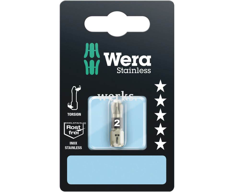 Надежная насадка Pozidriv Wera 3855/1 TS SB WE-073614 PZ 2 х 25 мм из нержавеющей стали с крестовым профилем PZ 2 длиной 25 мм, оснащенная цветовой маркировкой на наконечнике (черный - Pozidriv) и обозначением размера.
