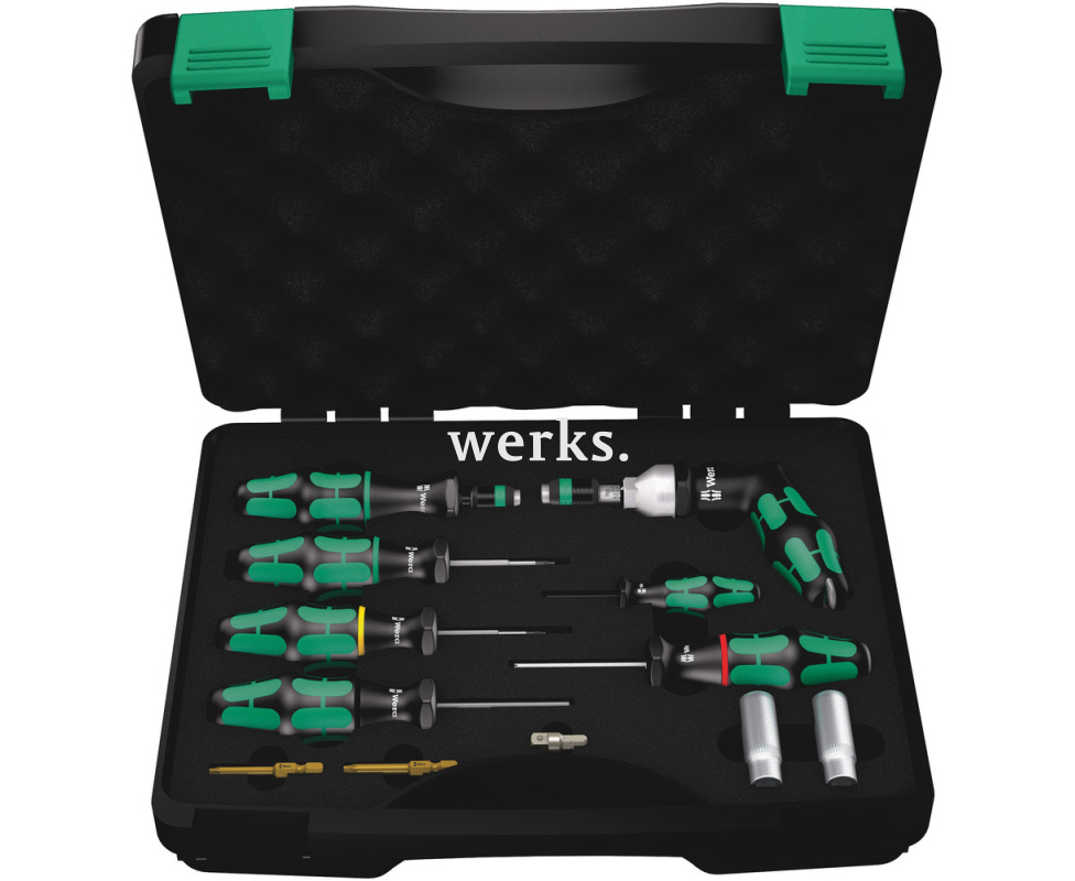 Подходит для производителей всех основных систем: Alligator, Beru, CUB, Herth & Buss, Schrader, VDO/Conti. В комплект входят: 1 динамометрическая отвертка с регулировкой, пистолетной формы, диапазоном 4,0-8,8 Нм; 1 динамометрическая отвертка с установкой на 3,3 Нм; 1 динамометрическая отвертка с установкой на 1,4 Нм TX 10; 1 динамометрическая отвертка с установкой на 1,25 Нм TX 10; 1 наконечник для вентиля; 1 бит 867/4 HF TX 15 x 50 мм с удерживающей функцией для винтов TORX; 1 бит 867/4 HF TX 20 x 50 мм с удерживающей функцией для винтов TORX; 1 отверточная насадка 790 A/50 SW 11,0 x 50 мм; 1 отверточная насадка 790 A/50 SW 12,0 x 50 мм; 1 переходник 870/1; 1/4' шестигранник на 1/4' квадрат; 1 инструмент для ввинчивания вентиля с моментом 0,25 Нм; 1 инструмент для ввинчивания вентиля с моментом 0,45 Нм. 074746
