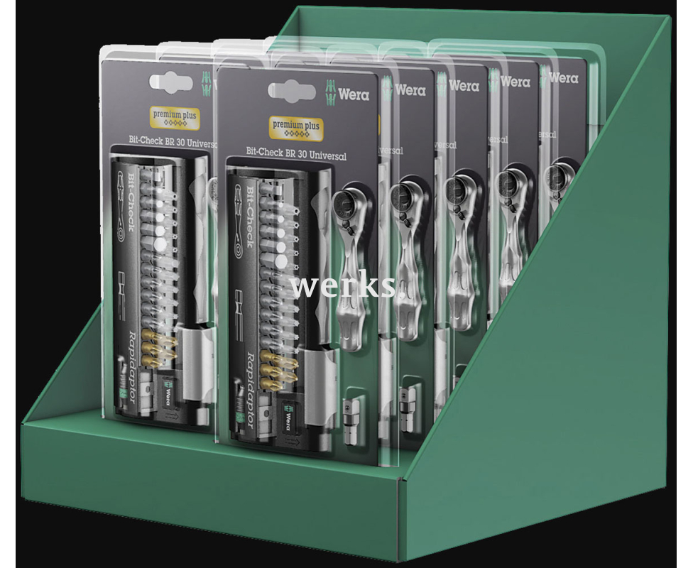 Дисплей для демонстрации наборов Wera с трещоткой и битами.