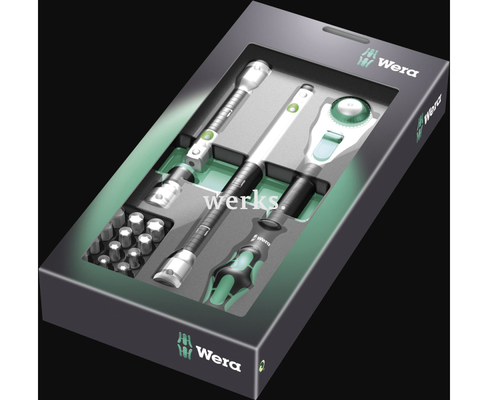 Комплект из 19 предметов с трещоткой и разнообразными насадками, размещенный в пенопластовом вкладыше. Он идеально подходит для мастерских, использующих тележки таких брендов, как Stahlwille, Hazet, Gedore, Matador, Facom, Carolus, Berner, Kraftwerk, KS-Tools, Würth и Förch, а также для верстаков. Размеры составляют 342 мм x 174 мм, с возможностью изменения до 310 мм x 158 мм. При необходимости, перегородки можно подрезать, чтобы адаптировать вкладыш под существующий выдвижной ящик. Профессиональный модуль-вставка Wera Zyklop Speed 8100 SC 5 включает трещотку Wera Zyklop Speed 8000 C, два удлинителя, держатель с быстрозажимным патроном и 15 бит (HEX, PH, PZ, TORX). Это удобный и многофункциональный набор, подходящий для монтажных и ремонтных работ, включая труднодоступные места. Поставляется в компактной коробке с пенопластовым вкладышем, что делает его удобным для хранения в верстаке или инструментальной тележке.