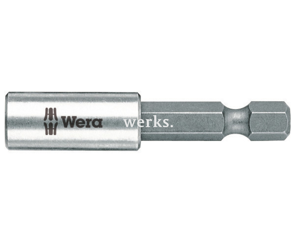 Универсальный держатель WE-134480 профессионального класса, длиной 50 мм и диаметром рабочей части 10,5 мм, оснащен гнездом для бит 1/4' и приводом шестигранником 1/4'. Он имеет мощный постоянный магнит и совместим с насадками по стандарту DIN 1173-C 6,3, а также с рядом соединений Wera 1.