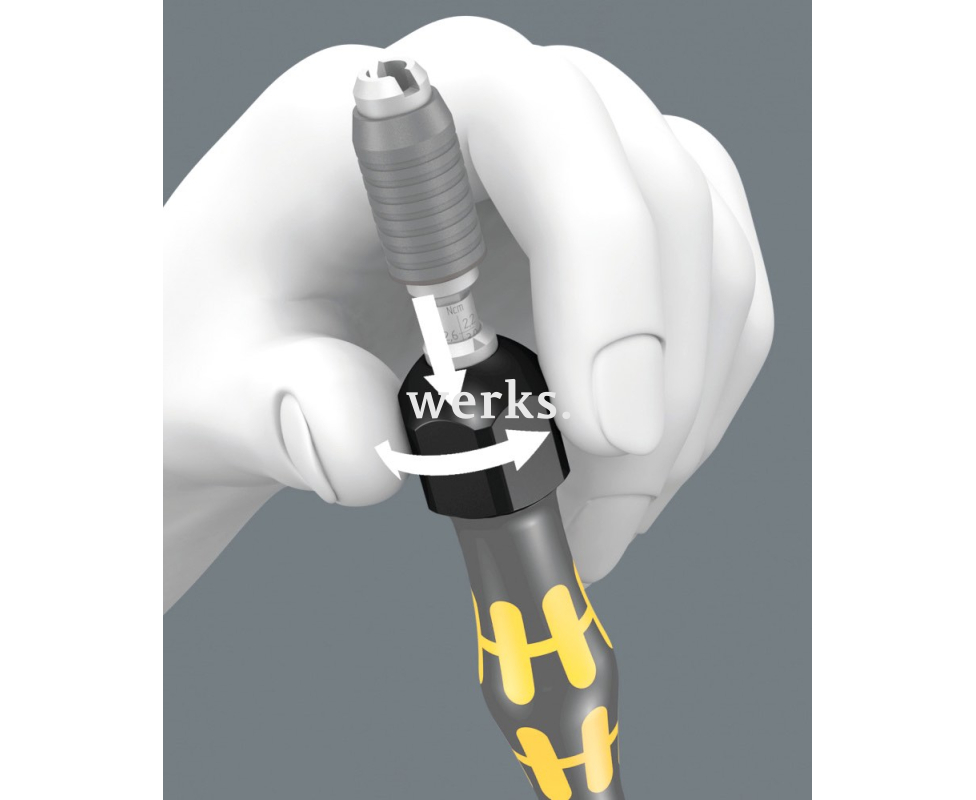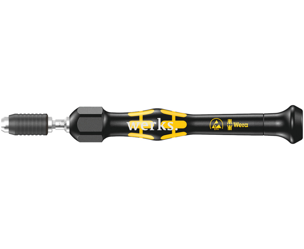 Регулируемая динамометрическая отвертка 0,02-0,06 Нм (погрешность - 10%) с быстрозажимным патроном Wera Kraftform Micro ESD 1460 предназначена для насадок с хвостовиками Halfmoon 4 мм и HIOS 4 мм. При достижении заданного момента затяжки слышен четкий щелчок. Момент силы при отвинчивании не ограничен. Антистатическая рукоятка защищает от перекатывания и оснащена вращающимся наконечником. Инструмент подходит для завинчивания крепежа, чувствительного к электростатическим разрядам, с контролем момента затяжки.