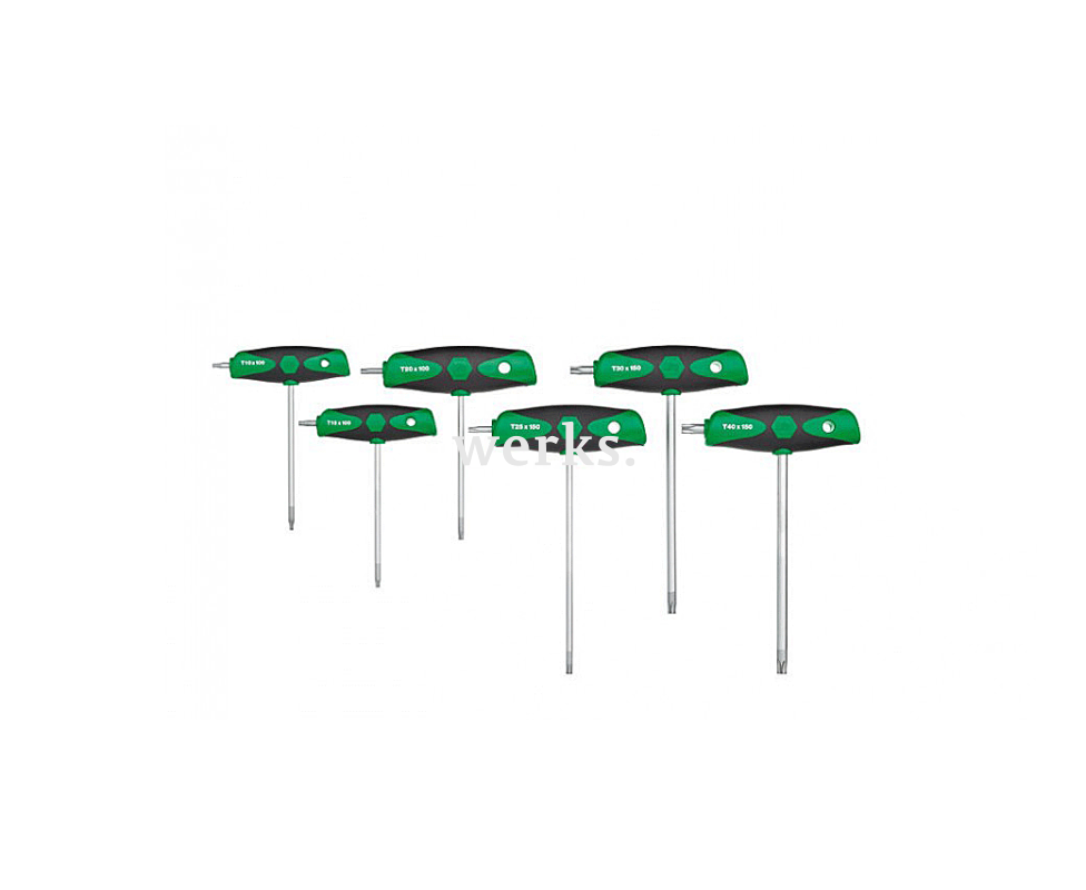 Профессиональный набор штифтовых ключей TORX с рукояткой ComfortGrip изготовлен из хромванадиевой стали с полной закалкой и матовым хромированием. Он предназначен для закручивания и выкручивания сильно зажатых винтов. Обладает надежным боковым приводом. Включает в себя самые популярные профили TORX, от T10 до T40, и состоит из 6 предметов. Материал: CR-V, полная закалка Особенности: боковой привод