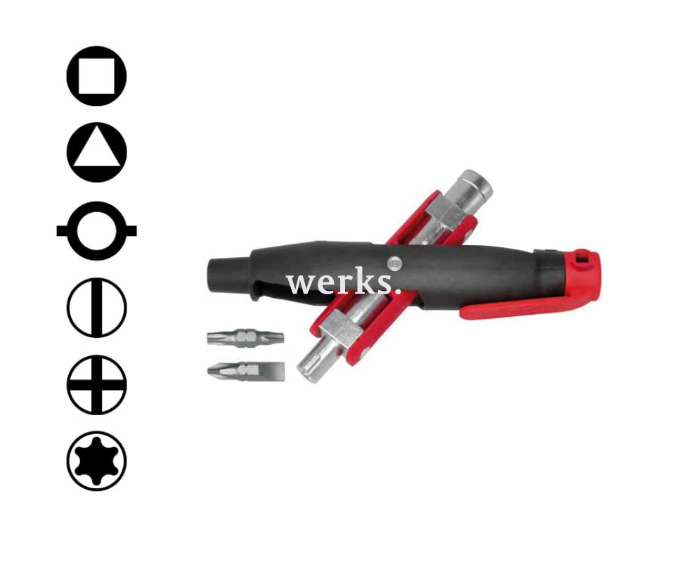 Универсальный ключ, оснащенный основными профилями, предназначен для работы с запорными системами распределительных шкафов в области электротехники, газо- и водоснабжения, а также в системах кондиционирования и вентиляции. Все профили объединены в одном компактном инструменте. Корпус изготовлен из прочного пластика с добавлением стекловолокна. Двойной поворотный механизм позволяет использовать все ключи. Имеется два крепления для бит 1/4 дюйма. Поставляется в блистерной упаковке.