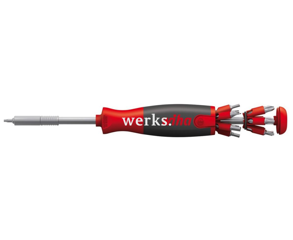 Магазинный держатель для бит с профилями прямой шлиц, Phillips, Pozidriv, HEX, TORX и Robertson, выполненный из хромванадиевой стали и оснащенный многокомпонентной рукояткой SoftFinish. Открытие магазина осуществляется простым нажатием кнопки. Надежное крепление бит обеспечивается неодимовым магнитом. Узкая конструкция держателя SuperSlim позволяет работать в ограниченных пространствах. Подходит для бит с шестигранником 1/4', включая MaxxTor. В комплект входят 13 двусторонних бит, компактно размещенных в рукоятке в два ряда. Это отличная и полноценная альтернатива набору отверток. Поставляется в блистере. Материал: CR-V, полная закалка. Форма: шестигранник 1/4'.