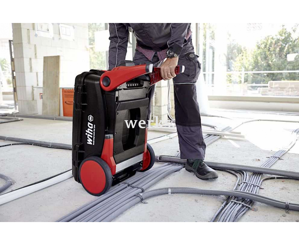 Обширный комплект диэлектрического инструмента, необходимого для точных и аккуратных электротехнических работ. Имеет сертификаты VDE и GS. Обеспечивает безопасное использование при напряжении до 1000 В переменного и 1500 В постоянного тока. Упакован в прочный пластиковый чемодан с замками, большими колесами и телескопической ручкой для удобной транспортировки. Благодаря откидным ножкам чемодан может служить в качестве стремянки для работ на высоте. В комплект входит 100 предметов, что позволяет выполнять полный спектр задач профессионального электрика. Вес: 21600 г.