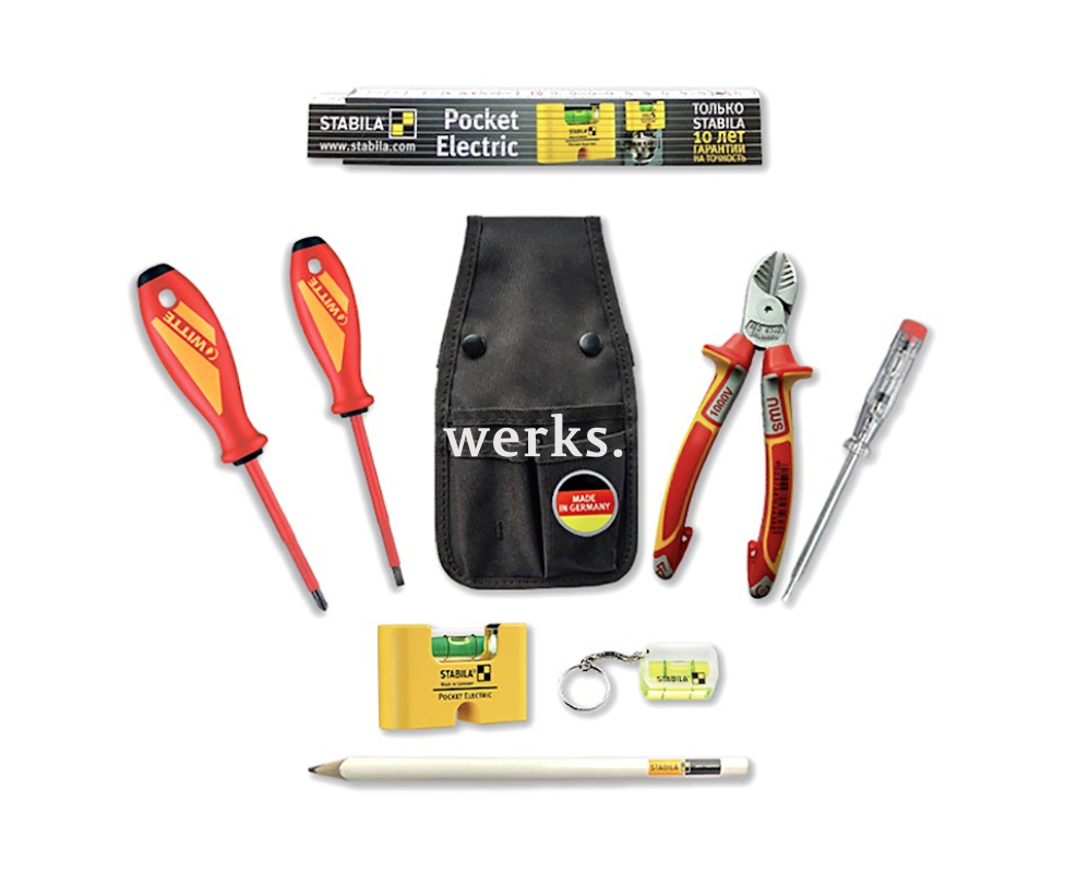 В комплект входят 8 предметов: 2 отвертки VDE SL и PH, пробник напряжения длиной 100 мм, бокорезы VDE NWS 160 мм, складной метр Stabila длиной 2 м, карманный пузырьковый уровень Stabila Pocket Electric, брелок-пузырьковая камера Stabila и карандаш. Все инструменты соответствуют стандартам VDE и безопасны для работы с элементами под напряжением до 1 000 В переменного тока. Поставка осуществляется в прочной поясной сумке размером 300х140х40 мм.