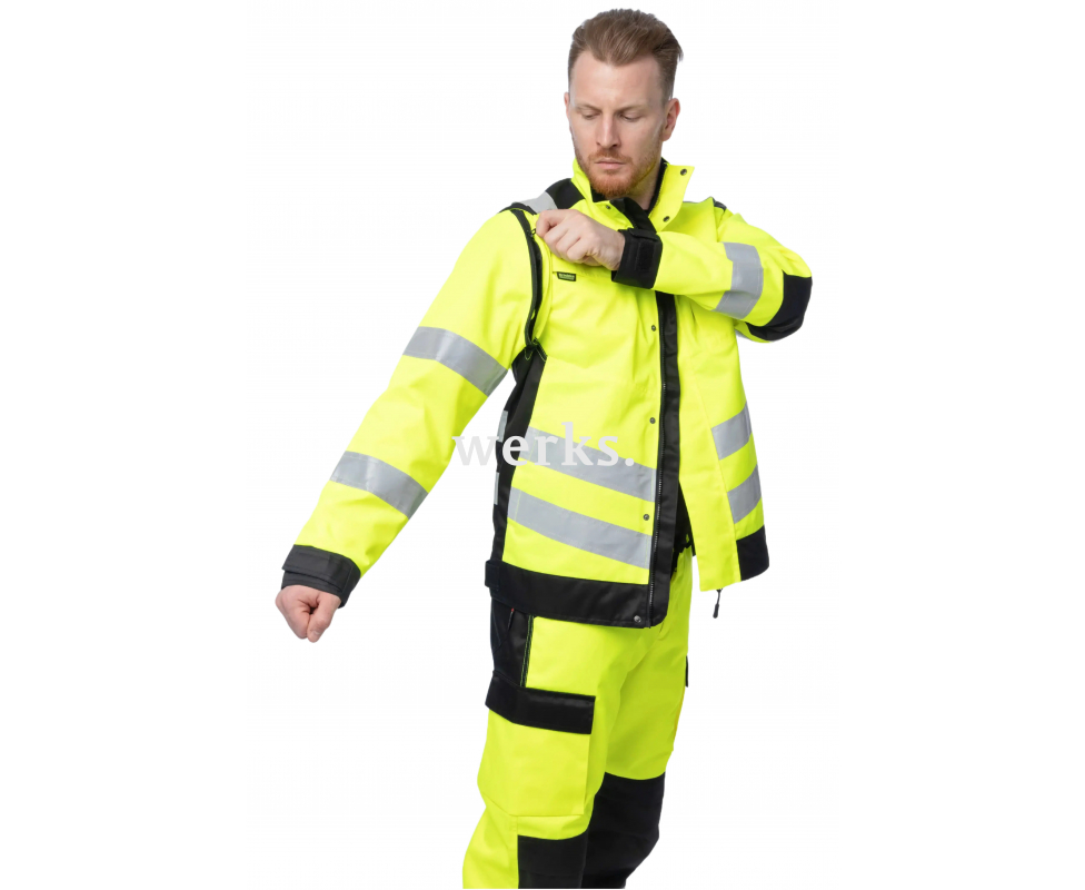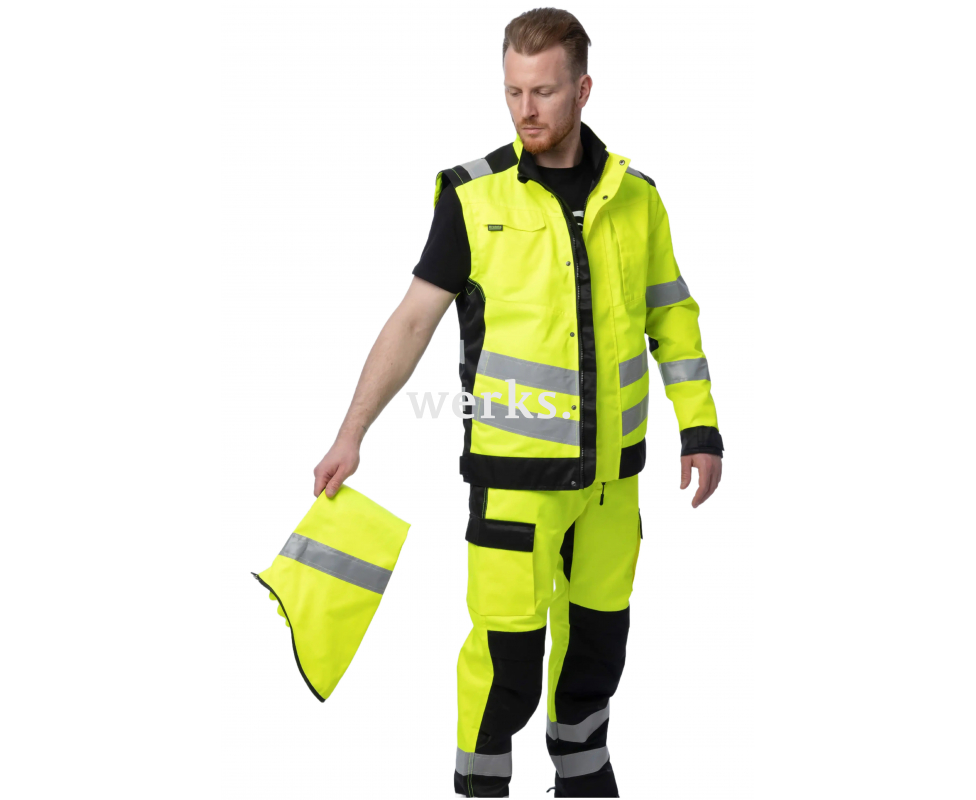 Сигнальная куртка Brodeks KS 225 - удобная и практичная рабочая куртка 2 класса видимости с защитой от воды, масел, смол, брызг кислот и щелочей. Уникальная особенность модели – рукава на молнии можно снять и использовать изделие как сигнальный жилет. Куртка подойдёт тем специалистам, кто работает летом на улице или в помещениях в условиях сильных загрязнений и где важна повышенная заметность. 2 класс видимости Защищает от воды, масел, брызг кислот и щелочей Трансформер: рукава отстёгиваются, куртка превращается в жилет Удлинённая задняя часть Эргономичный крой позволяет активно двигаться Маркие места из ткани чёрного цвета Воротник-стойка придаёт аккуратный внешний вид Центральная молния с планкой для защиты подбородка Ветрозащитная планка Рукава пристегиваются на молнии Сетчатая подкладка на передней части 5 карманов: 2 кармана на молнии для рук, 2 нагрудных кармана, 1 внутренний сетчатый карман Лента с карабином для ID/бейджа в нагрудном кармане Низ куртки и манжеты регулируются патами на липучках Световозвращающие ленты 5 см Материалы: Материал верха: Rebel (33% хлопок, 67% полиэфир), 245 г/м2, МВО-пропитка При помощи технологии биверного плетения полиэфир в составе ткани Rebel выведен наружу. Ткань дополнительно обработана масловодооталкивающей пропиткой. Таким образом обеспечивается высокая устойчивость к различным видам загрязнений, маслам, растворам кислот и щелочей. Подробнее о ткани...